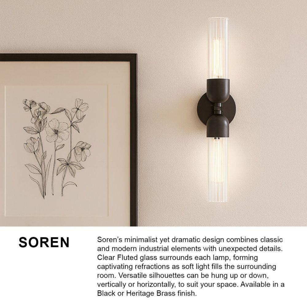 Soren’s minimalist yet dramatic design combines classic and modern industrial elements with unexpected details. Clear Fluted glass surrounds each lamp, forming captivating refractions as soft light fills the surrounding room. Versatile silhouettes can be hung up or down, vertically or horizontally, to suit your space. Available in a Black or Heritage Brass finish.