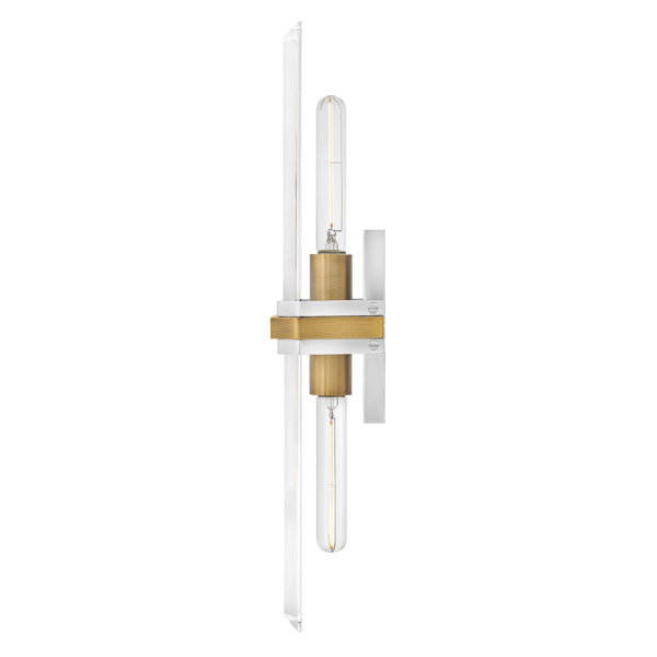 Provide illumination in a transitional style, Hinkley's Kipton Bath Wall Sconce provides a soft luminous glow in a fashionably manner, the fixture features a rectangular silhouette of clear and etched beveled glass with a two-tone belt holding the shade to the short rectangular backplate. The cool Polished Nickel finish with the warm Heritage Brass accent drape this piece in a modest luxurious feel. This sconce produces a graceful glow of light to any space, whether it illuminates a hallway, bedroom, or living room, this fixture will naturally elevate any space. Hinkley has a 2-year limited warranty, subject to certain exclusions and conditions.