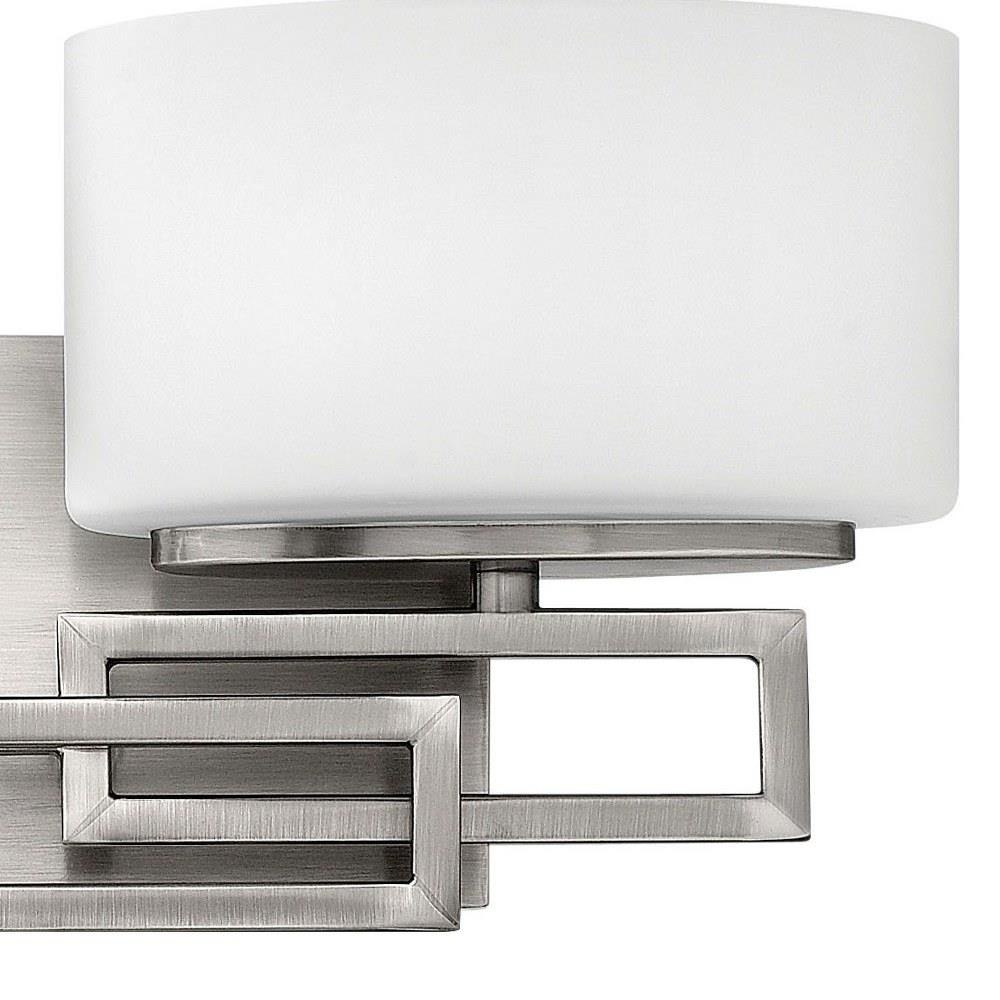 Lanza features contemporary styling with geometric patterns that are emphasized in Antique Nickel and Brushed Bronze finishes. The elongated oval, etched opal glass reinforces its sleek design.
