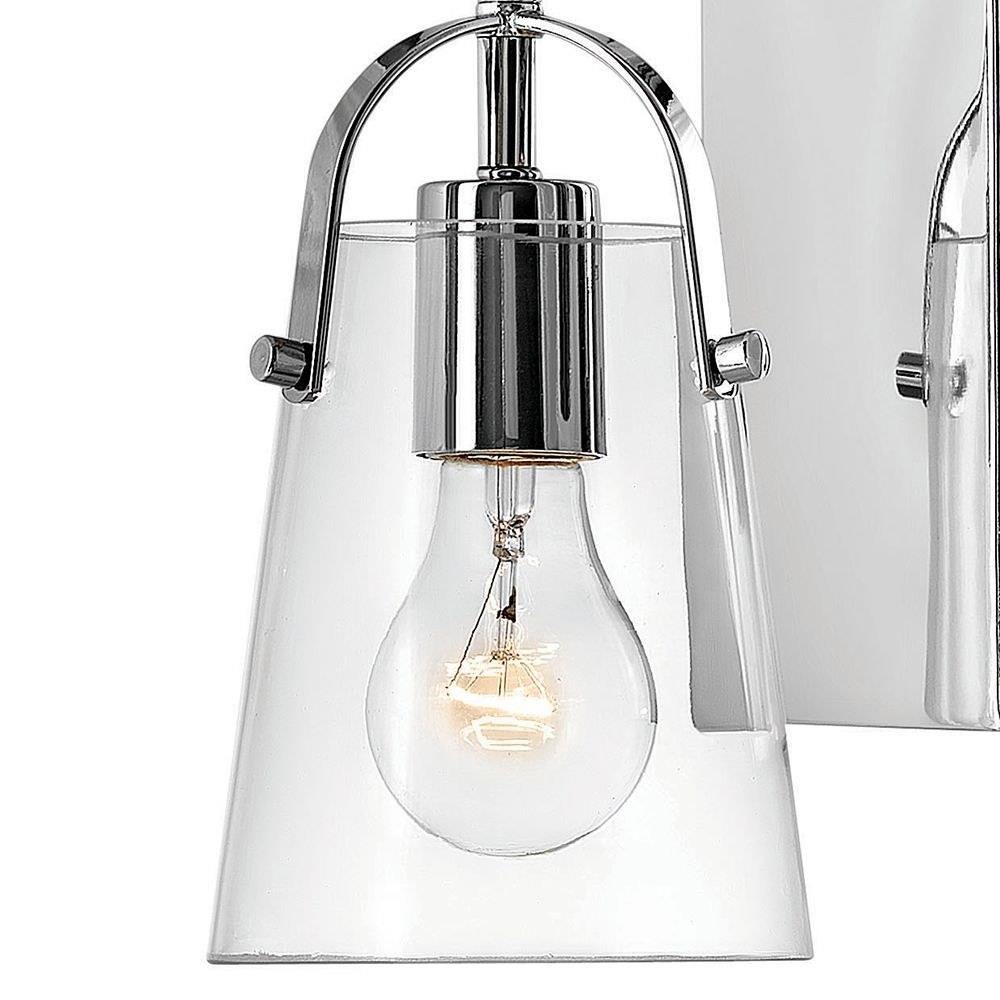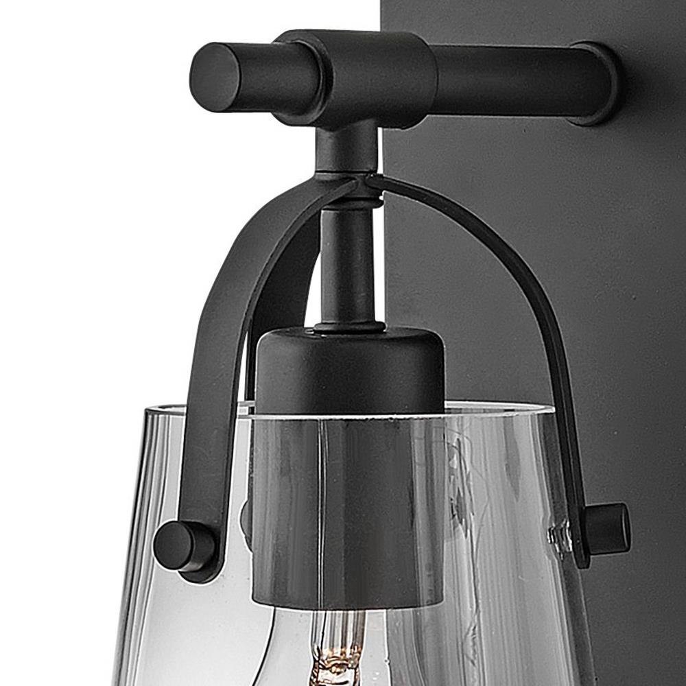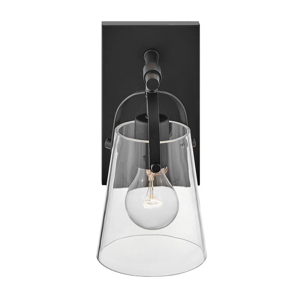 Clean and airy, Foster breathes composed simplicity into any bath space. Its softly tapered glass shade, suspended from arched handle prongs, creates a sophisticated transitional silhouette, enhanced by practical yet stylized details.