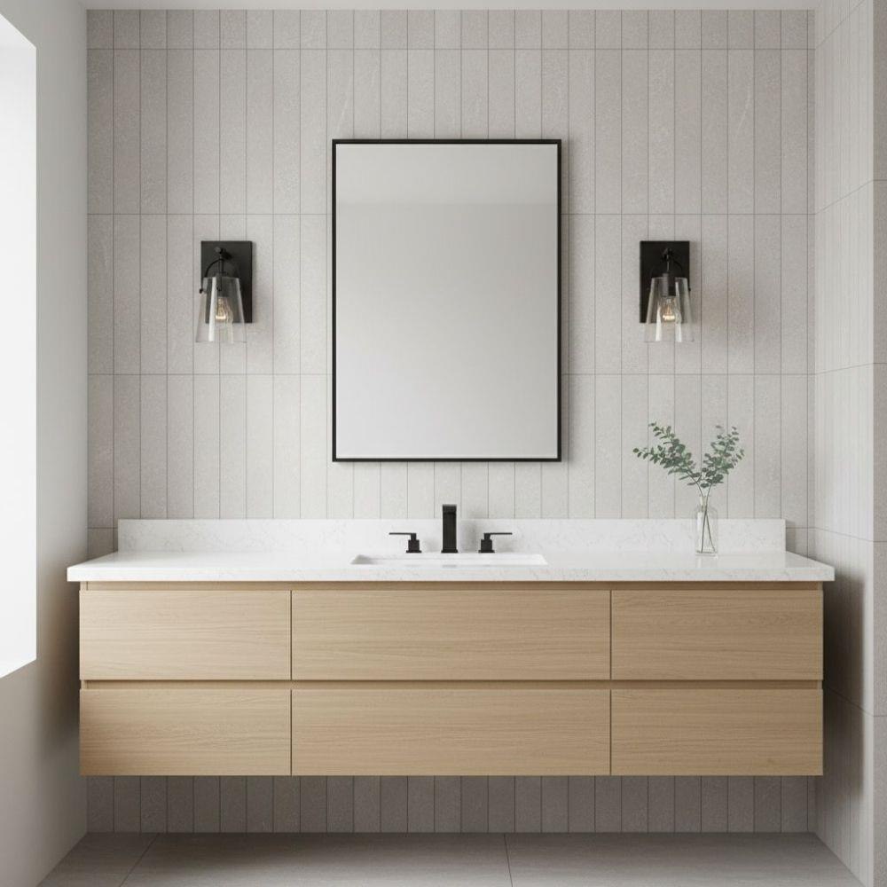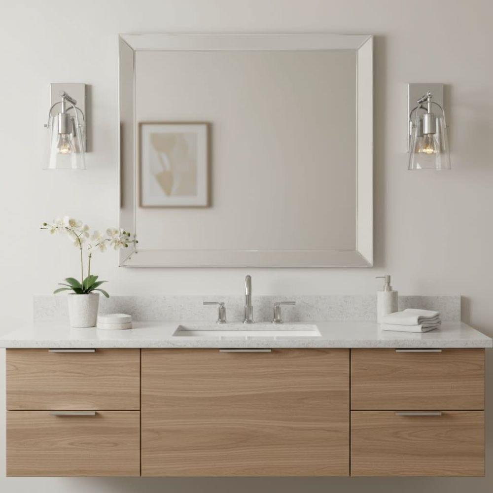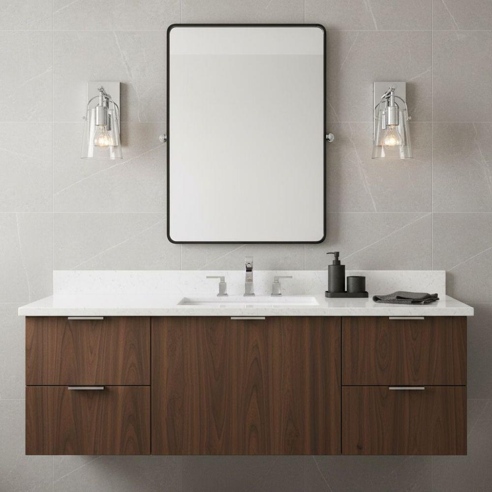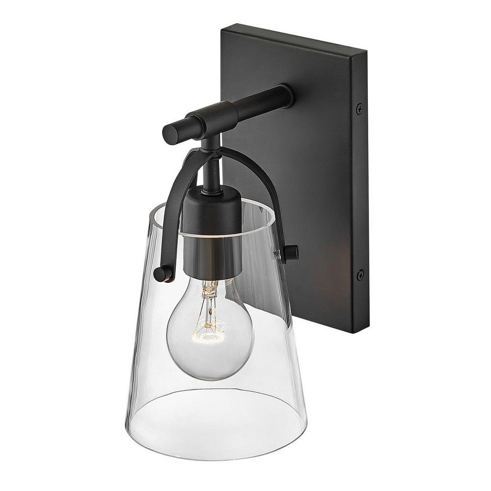 Clean and airy, Foster breathes composed simplicity into any bath space. Its softly tapered glass shade, suspended from arched handle prongs, creates a sophisticated transitional silhouette, enhanced by practical yet stylized details.