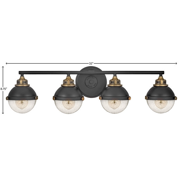 This Four Light Bath Vanity fixture's decorative details are noticed, infusing character in bathrooms, ensuites, and powder rooms. Heritage Brass cast knobs secure Clear Seedy Glass shades in place, while the deep, classic Black finish complements multiple decors - Chic, Classic, Industrial, Transitional, and Vintage. This set of lights can be mounted up or down, and each globe is illuminated by an 8w Medium LED bulb (not included).