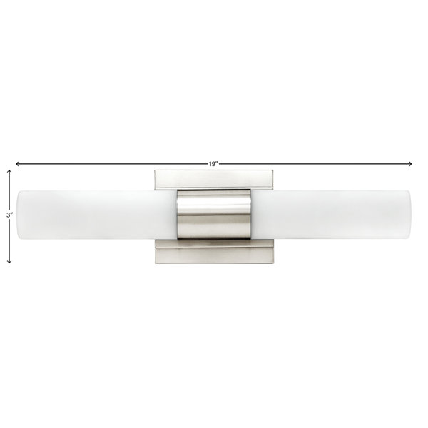 The tailored Transitional style of this medium LED bath vanity is a sleek, contemporary light fixture that is damp-rated for bathrooms and powder rooms, but stylish for installation elsewhere in your home. The reflective Polished Nickel bracelet grasps the linear Etched Opal glass, extending from the backplate that can be installed either horizontally or vertically. Illuminated by (2) integrated 16w LED light sources, this wall sconce is ADA-compliant and dimmable (with a CL-type dimmer SSL7A).