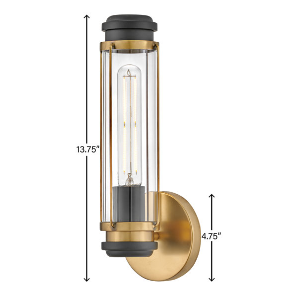 This Transitional Nautical Chic single light bath vanity fixture features contrasting finishes combined with sleek lines and a commanding profile. This versatile bath sconce can be mounted up or down, vertically or horizontally. A T9 or T10 bulb (not included) mounts inside a long, clear glass cylindrical shade within a Heritage Brass nautical-style cage outside, and styled Black caps on each end.