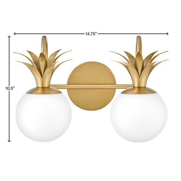 This Small Two Light Vanity is a combination of Old World glamour and modern sophistication with timeless touches of a classic pineapple motif. A warm, textured Heritage Brass finish with an globe-style shade in an Etched Opal glass pairs perfectly with a 60w G9 LED bulb (not included). Damp rated, this light is perfect for the bathroom or any other space in the home.