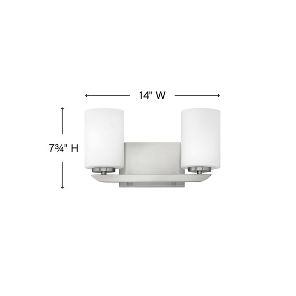 Hinkley's Kyra Small Two Light Vanity has a bold design with a minimalist style and will complement a variety of décor. A durable finish with a cylinder-style shade in a Etched Opal glass pairs perfectly with two 14w Medium LED bulbs (not included). Damp rated, this light is perfect for the bathroom or any other space in the home.