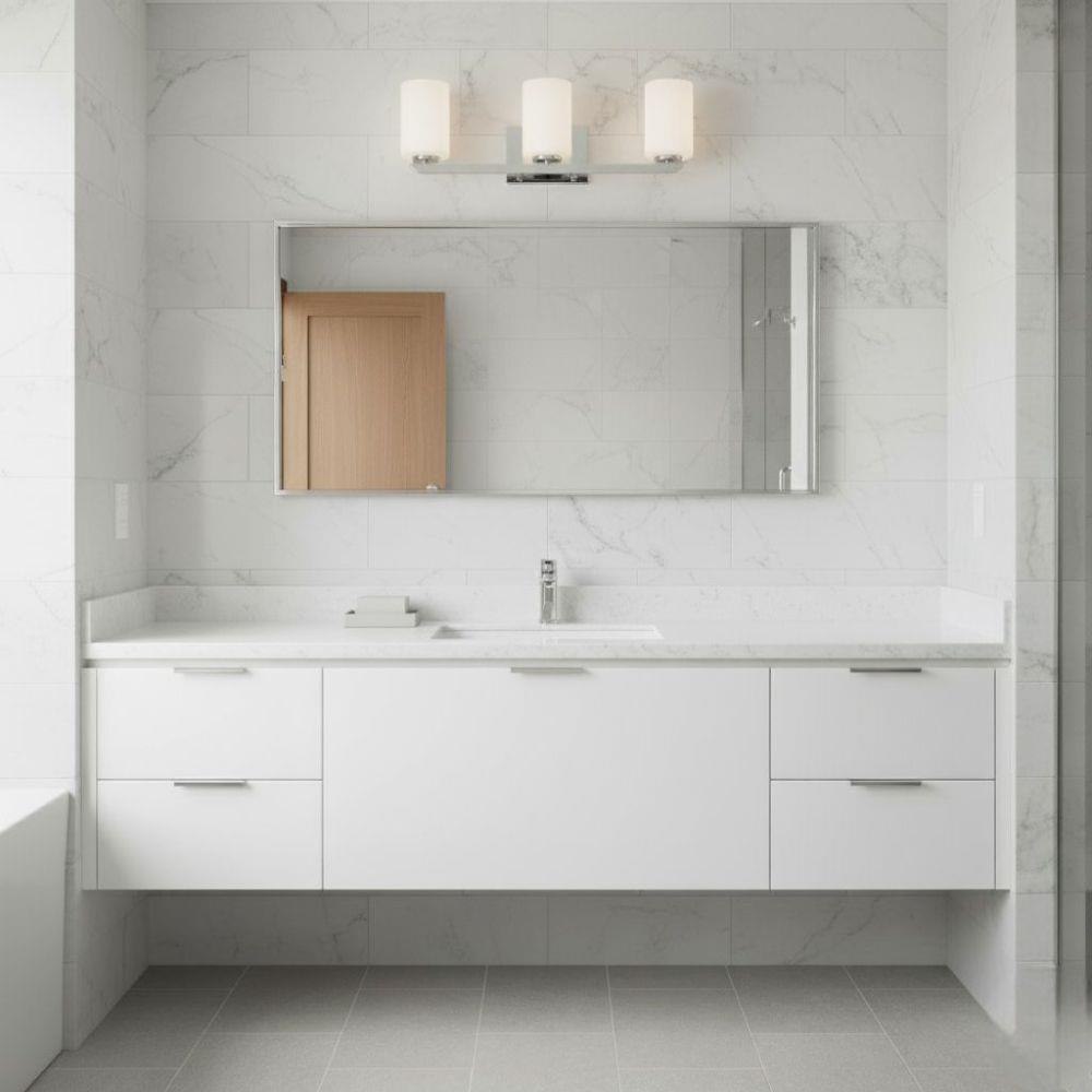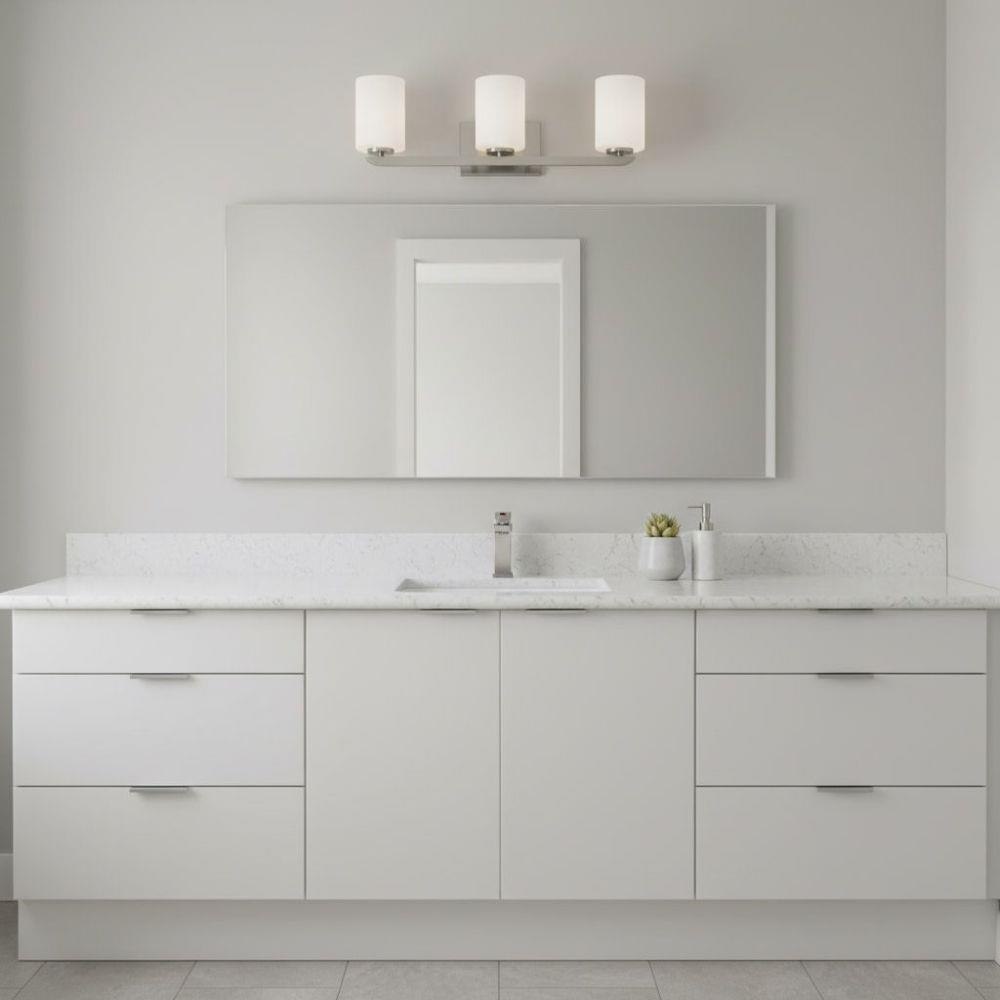 Clean and crisp, Kyra's minimalist design is anchored with a bold yet simple aesthetic. The sleek cross bar ends with a subtle curve for an element of softness. Rich finish options of Brushed Nickel or Polished Nickel complement the elegant etched opal glass.Fixture can be mounted either up or down / Suitable for use in damp locations as defined by NEC and CEC. Meets United States UL Underwriters Laboratories & CSA Canadian Standards Association Product Safety Standards / Classic matte brushed nickel finish / Mounting hardware is hidden on the backplate to ensure a clean silhouette / Merging the best of traditional and modern elements, with a sophisticated and streamlined look