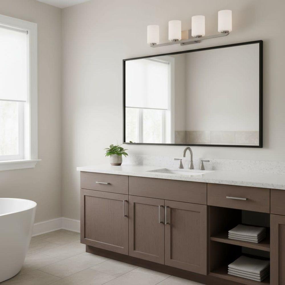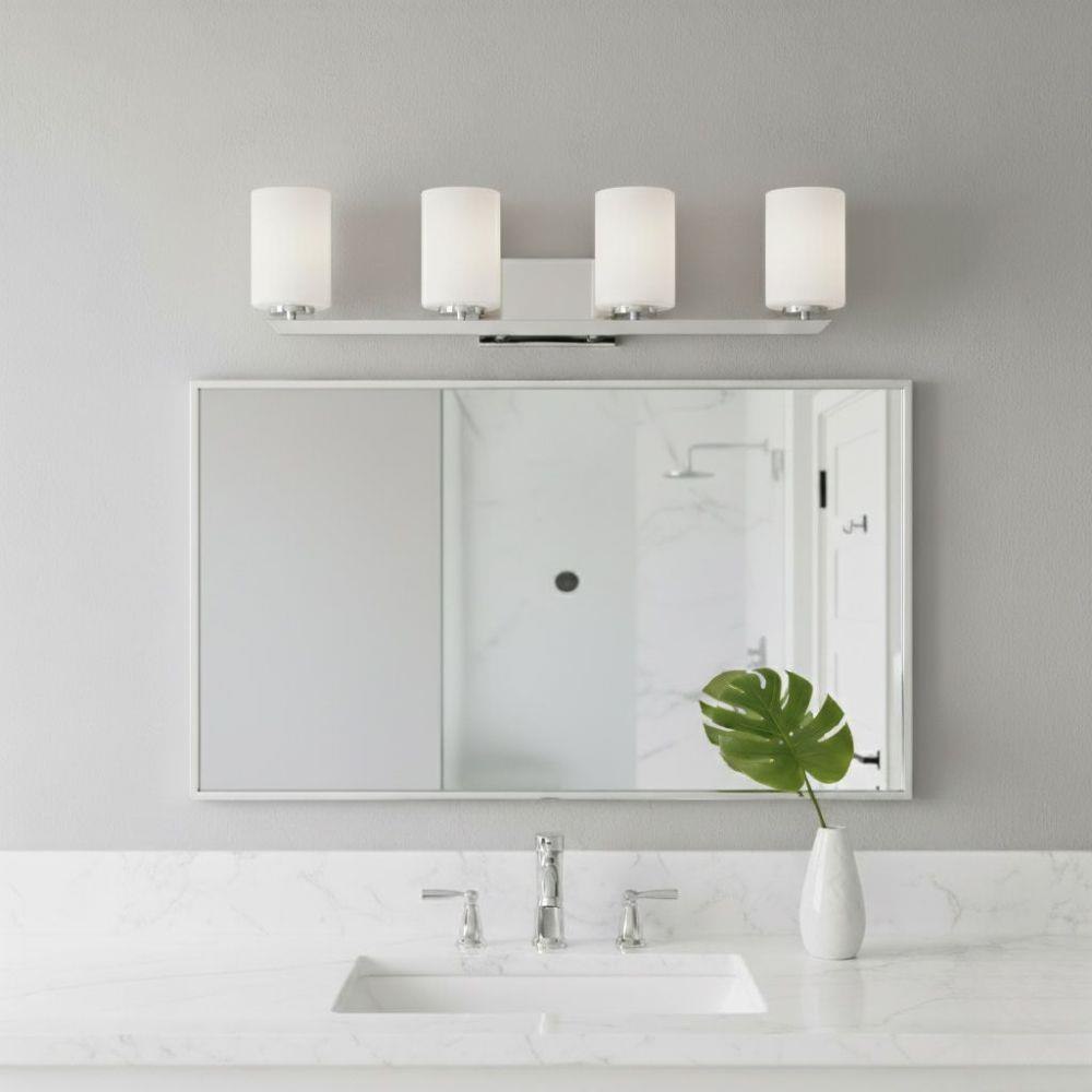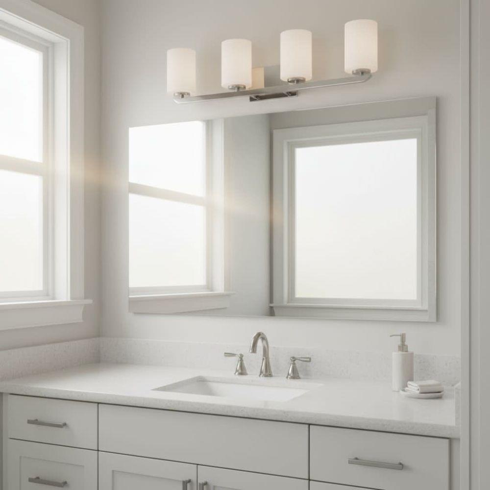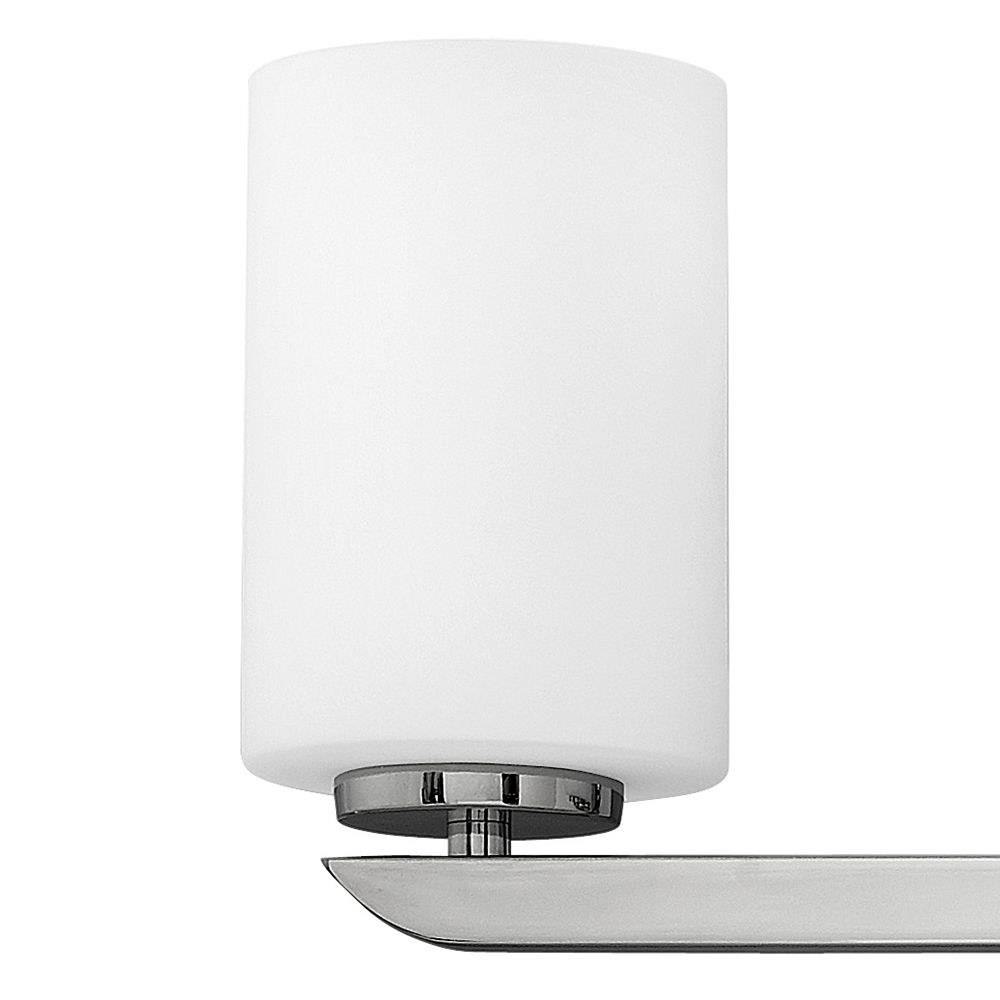 Clean and crisp, Kyra's minimalist design is anchored with a bold yet simple aesthetic. The sleek cross bar ends with a subtle curve for an element of softness. Rich finish options of Brushed Nickel or Polished Nickel complement the elegant etched opal glass.