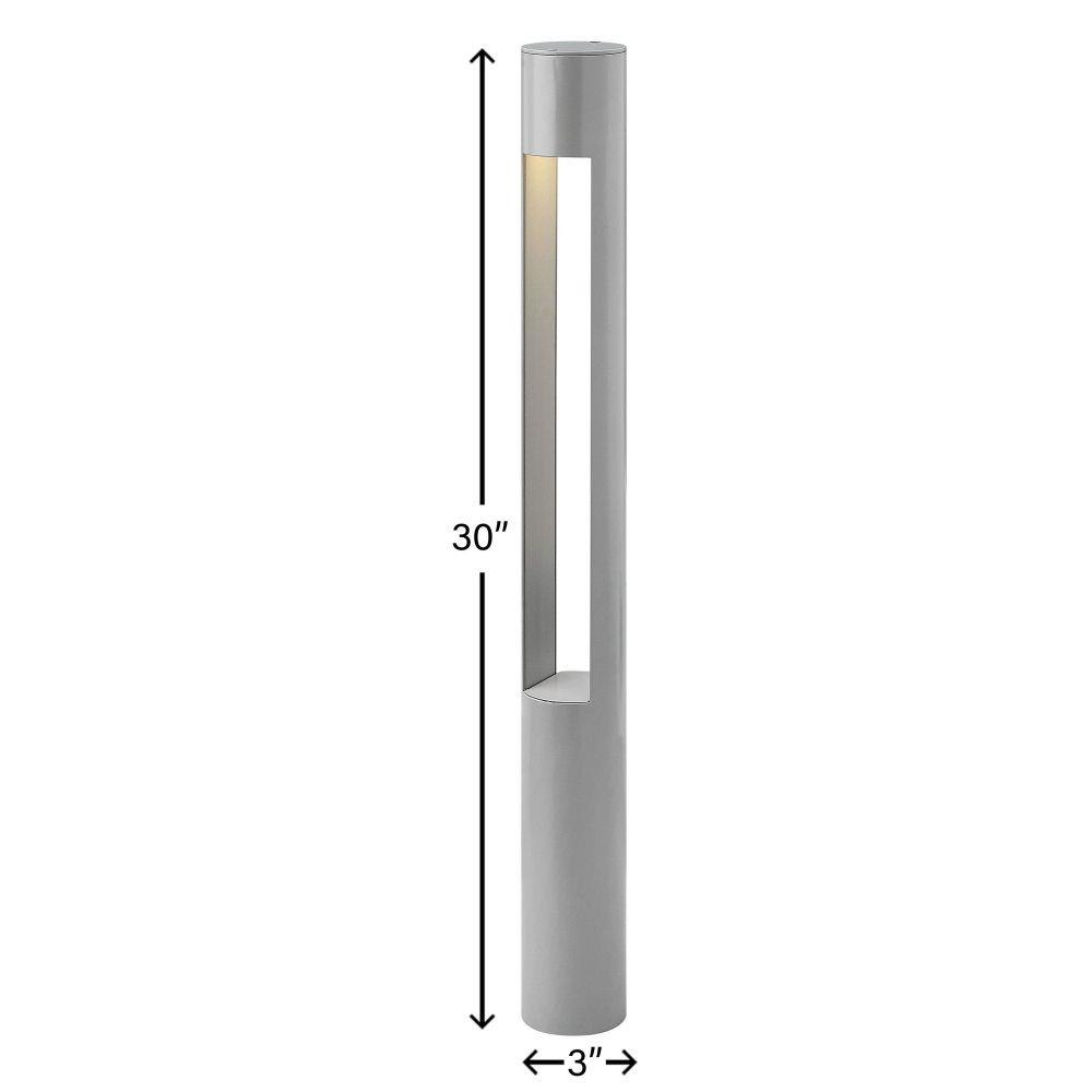 The Atlantis - 120V 8W LED Round Large Bollard presents a robust lighting solution designed for modern outdoor landscapes. Standing 30 inches tall with a 3-inch diameter and a width of 5.5 inches, this cylindrical bollard features a sleek titanium finish that complements contemporary architectural styles. Constructed from durable aluminum, it is engineered to withstand wet conditions, making it suitable for outdoor environments exposed to direct rain or sprinkler systems as defined by NEC and CEC standards.