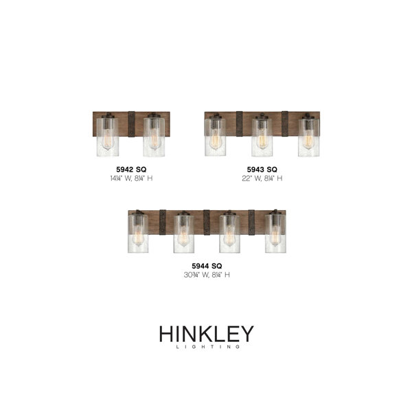 Hinkley's Sawyer Three Light Bath Vanity Sconce increases task lighting around mirrors or adds accent or ambient lighting. A cylindrical shade of Clear Seedy Glass is held in place with a threaded socket cover, allowing the fixture to be hung up or down. The warm Sequoia backplate is accented by a riveted band of Iron Rust at the top and bottom, carrying out the Farmhouse styling. Illuminated by (3) 10w Medium LED bulbs (not included) - choose a vintage filament for a personal touch.