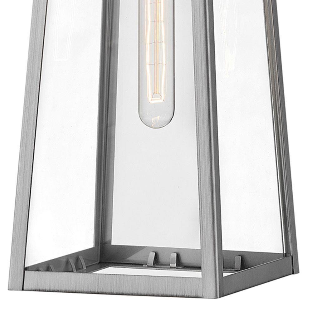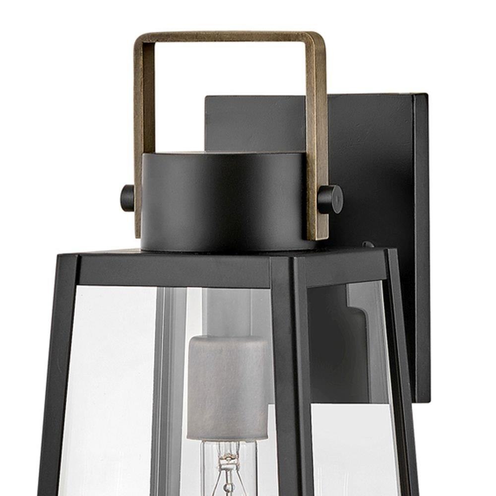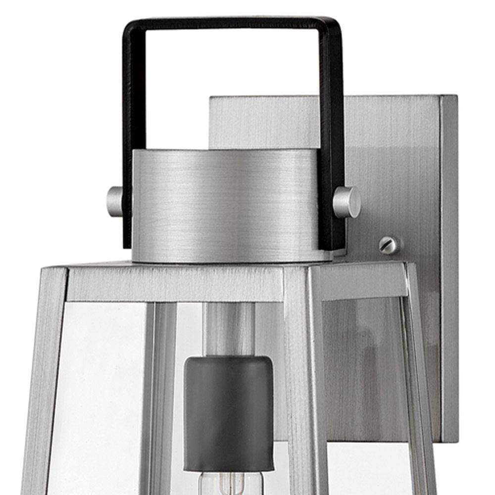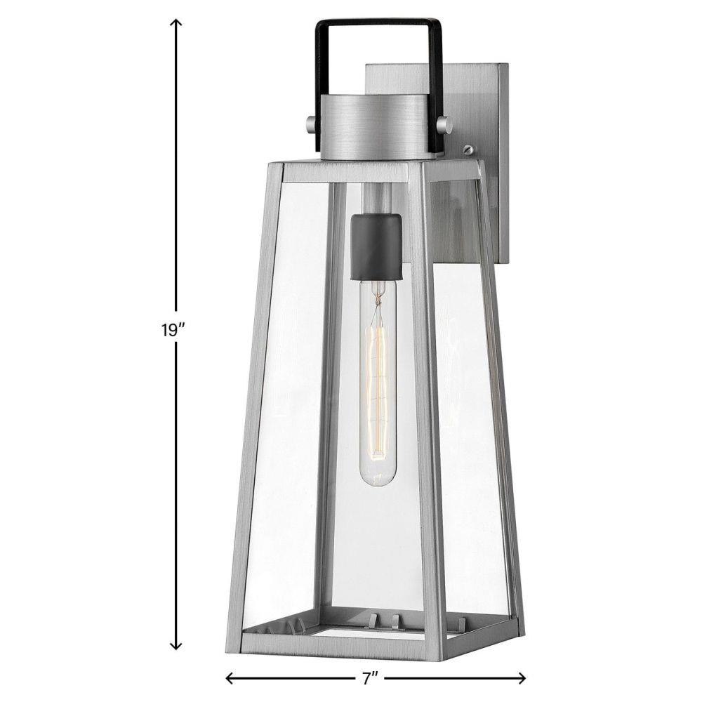 Hype up your alfresco area with the medium Hugh wall-mounted outdoor lantern. Its sleek transitional 1-light design highlights the over scaled clear glass panes, framed by a luxe two-tone metal finish in classic Antique Brushed Aluminum with a matte Black accent. Pro tip: we recommend a tubular vintage filament bulb to make Hugh pop on porches, patios, or amp up any exterior space.