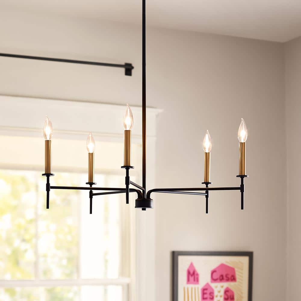 Introducing the Lark Hux 28" Chandelier, a perfect blend of turn-of-the-century traditional taste and minimalist modern chic. This stunning ceiling light features dramatic Black metal stems that beautifully contrast with dreamy Lacquered Brass candle sleeves, creating a bold and balanced design. With its classic style and 1-tier structure, this chandelier adds easy elegance to any space. The Hux Chandelier is dimmable and suitable for sloped ceilings, offering versatility in lighting options. Crafted from high-quality steel, it ensures durability and longevity. With a voltage of 120 and wattage of 60, this chandelier provides ample illumination. It accommodates 5 bulbs with a Candelabra base, compatible with both Incandescent and LED bulb types. The product dimensions are 28" in width, 8.75" in height, and 28" in length, with a maximum height of 36" when using the included downrod sizes. The chandelier is UL listed for safety and suitable for dry locations. Elevate your space with the Lark Hux 28" Chandelier, a timeless and captivating lighting fixture that adds a touch of sophistication to any room.