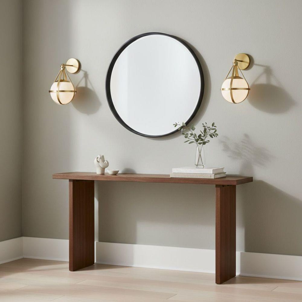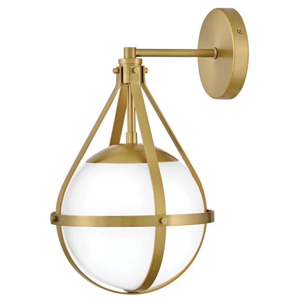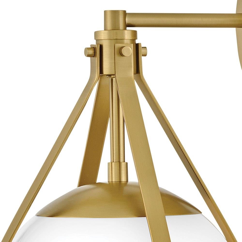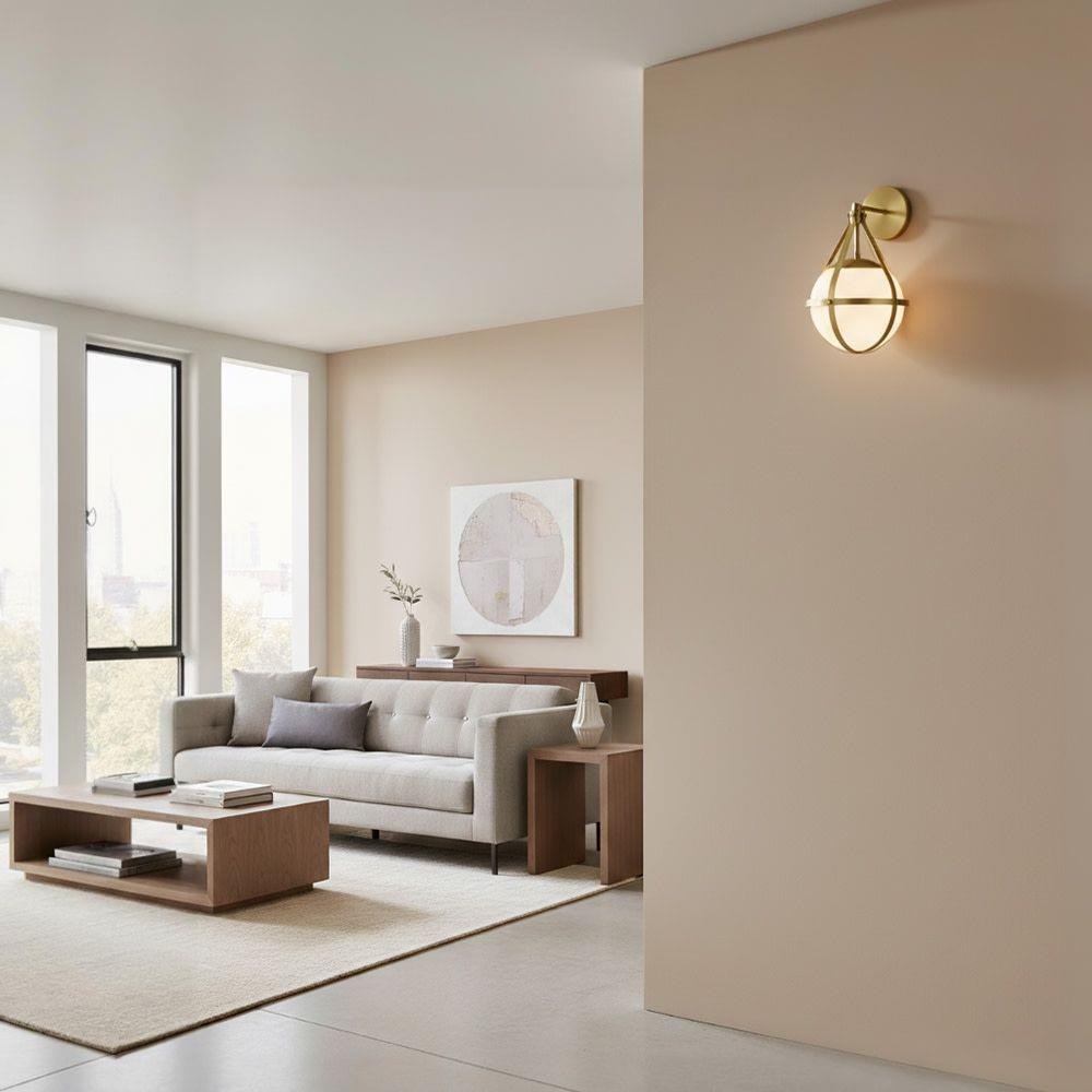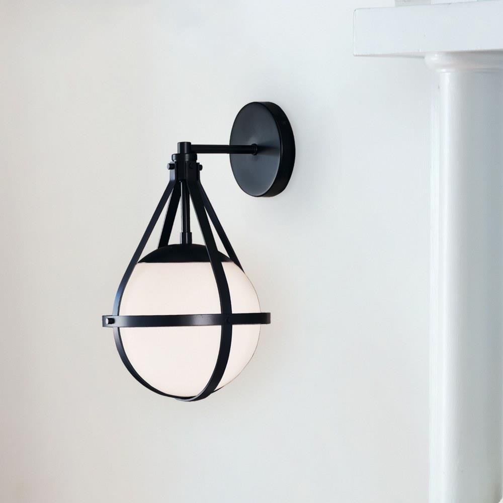 A retro, modern stunner, Colby’s cased opal glass globe, accentuated by a cage-style frame, creates unexpected glamour in any space.