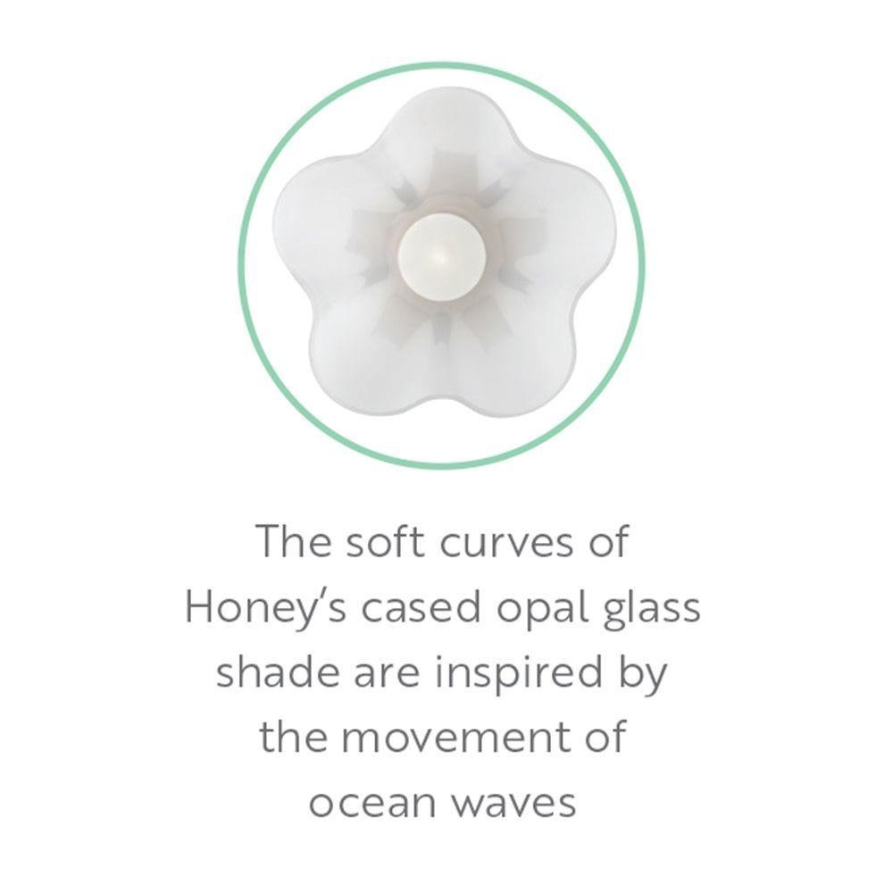 Charming and elegant, the softly flowing waves of Honey’s cased opal glass shade add a touch of lightness and whimsy to any décor style. Modern Black and Lacquered Brass finishes complement the ethereal white glass.