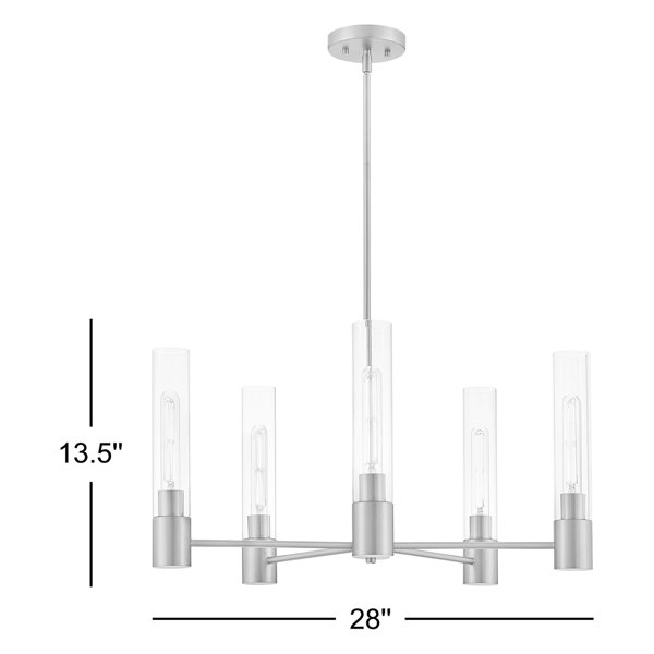 Overall: 28" W x 13.5" H; Canopy: 5.25" dia.; Lead wire: 72"; Down Rods: (1) 6", (2) 12"; Maximum Height: 46"; Shades: (5) 2.375" dia. x 11" H; Light Source: (5) 10 Med. LED bulbs (T-Style recommended, not included)
