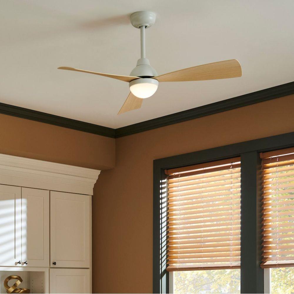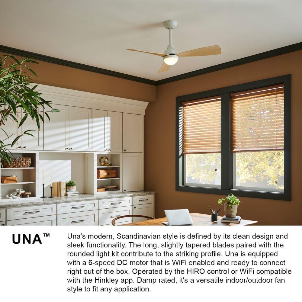 Una’s modern, Scandinavian style is defined by the clean design and sleek functionality. The long, slightly tapered blades paired with the rounded light kit contribute to the striking profile. Una is equipped with a 6-speed DC motor that is WiFi enabled and ready to connect right out of the box. Operated by the HIRO control or WiFi compatible with the Hinkley app. Damp rated, it’s a versatile indoor/outdoor fan style to fit any application.