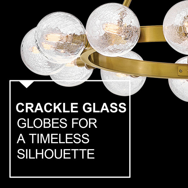 This Single Tier Chandelier invokes a rich glamorous feel, with its chain pendant cascading into a circular chandelier frame and crackled glass globes circling the fixture, this chandelier's natural exuberance entails a warm welcoming feel. This transitional design is finished in a lacquered brass which only further exudes a natural elegance.