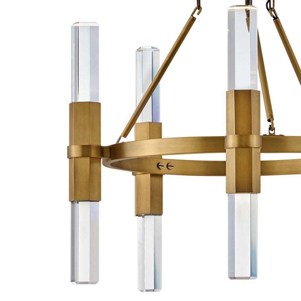 Cecily redefines modern glam with bold design elements that emanate a lux attitude. Dramatic and substantial faceted crystal rods; illuminated by an LED light source; pair perfectly with the chic Heritage Brass finish to create a breathtaking silhouette.
