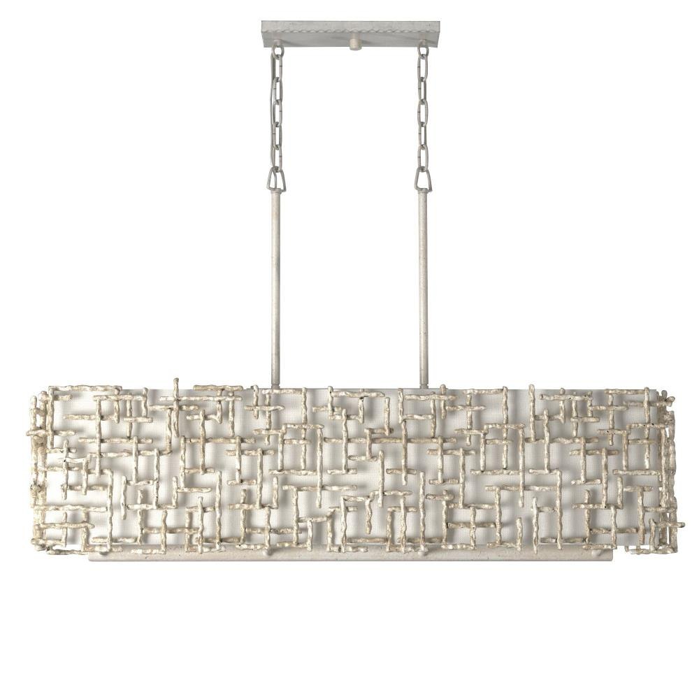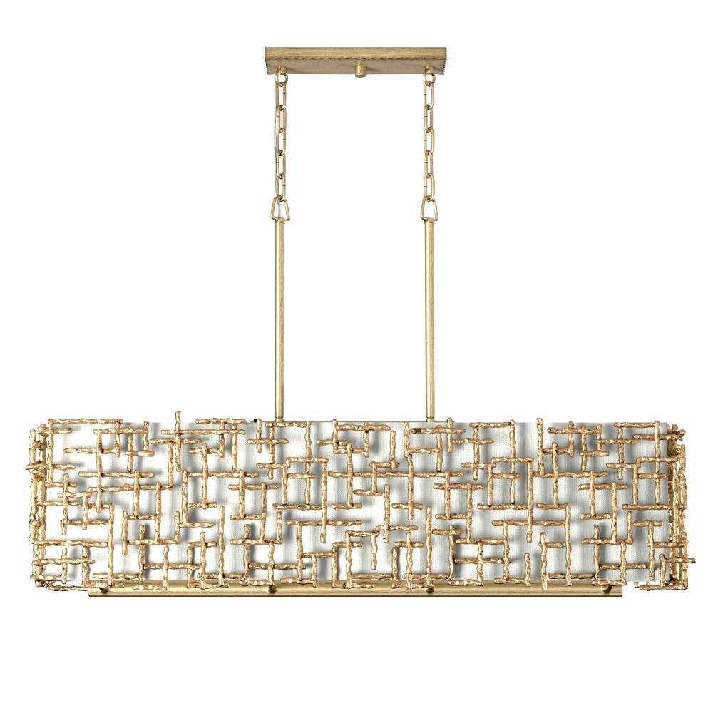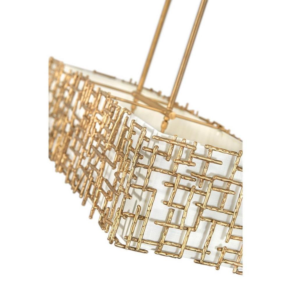 Farrah's contemporary design is bold and sculptural, while achieving an optical airiness. The hand-hammered crosshatch bars gleam in a hand-applied Silver Leaf or Burnished Gold finish with artisanal detailing that carries through to the canopy detail. Set against a White Linen shade, Farrah creates a look of deconstructed, modern elegance.This chain or cable hung fixture may be installed on any sloped ceiling.
