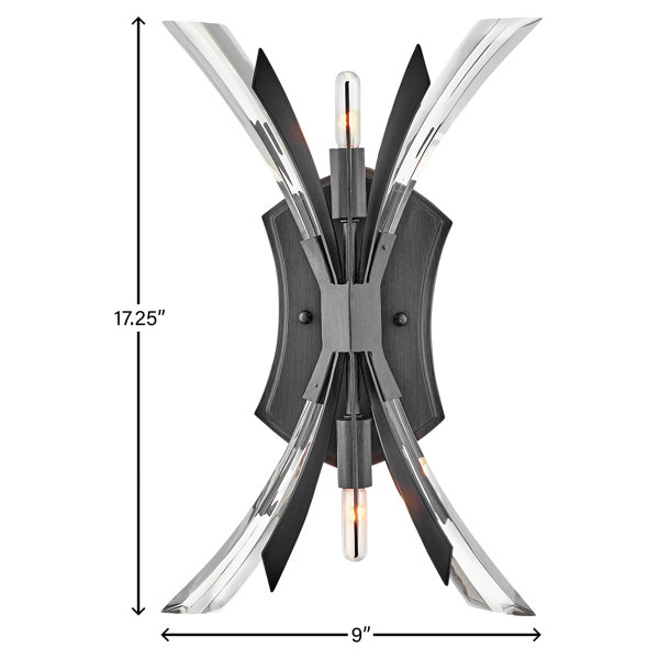 Curved Steel and Clear Crystal Shards combine in a contemporary burst design in the Vida Two Light Wall Sconce from Fredrick Ramond. Curved shards are gathered in the center by an H-shaped bracket mounted to a shield-shaped backplate, with two candelabra bulb sockets - one pointing up and one down - in the middle. In a leaden gray Brushed Graphite finish with subtle striations and a slight metallic shimmer, it can be mounted vertically or horizontally in a Modern Traditional wall fixture.