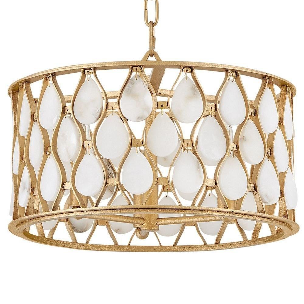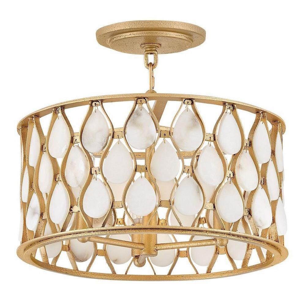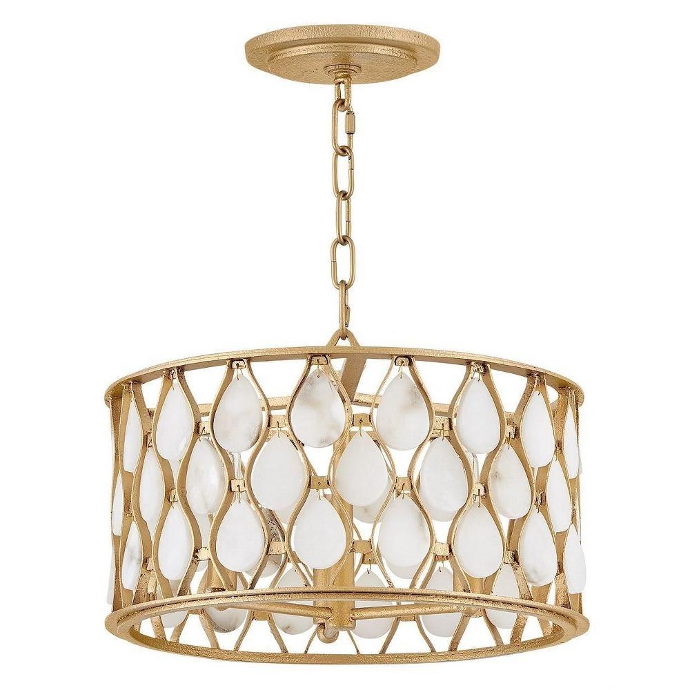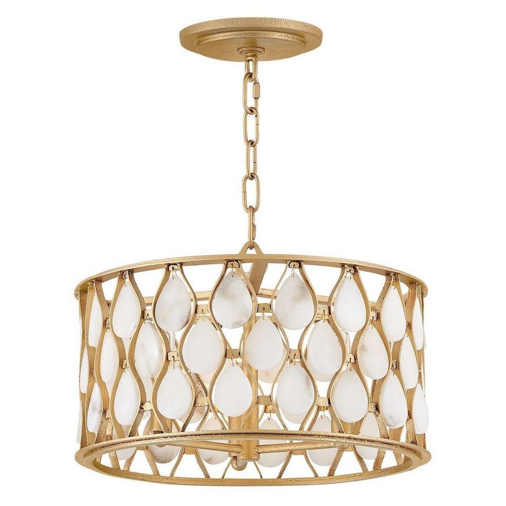 Opulently adorned with natural alabaster stones held within a traditional latticework shade, Estie brings organic elegance to any aesthetic. Intricately curved metalwork complements the frame, chain, and canopy in a textured Piastra Gold finish.