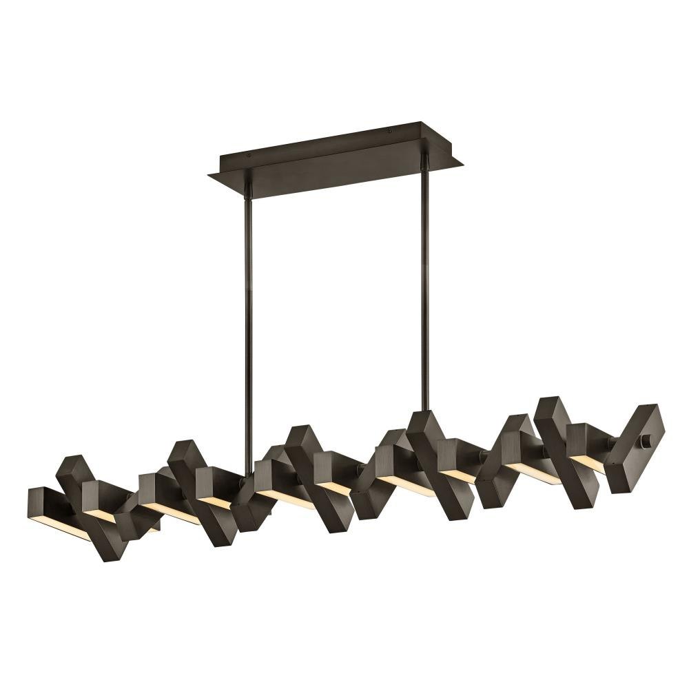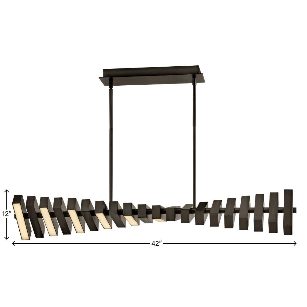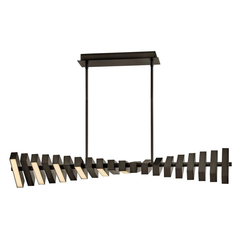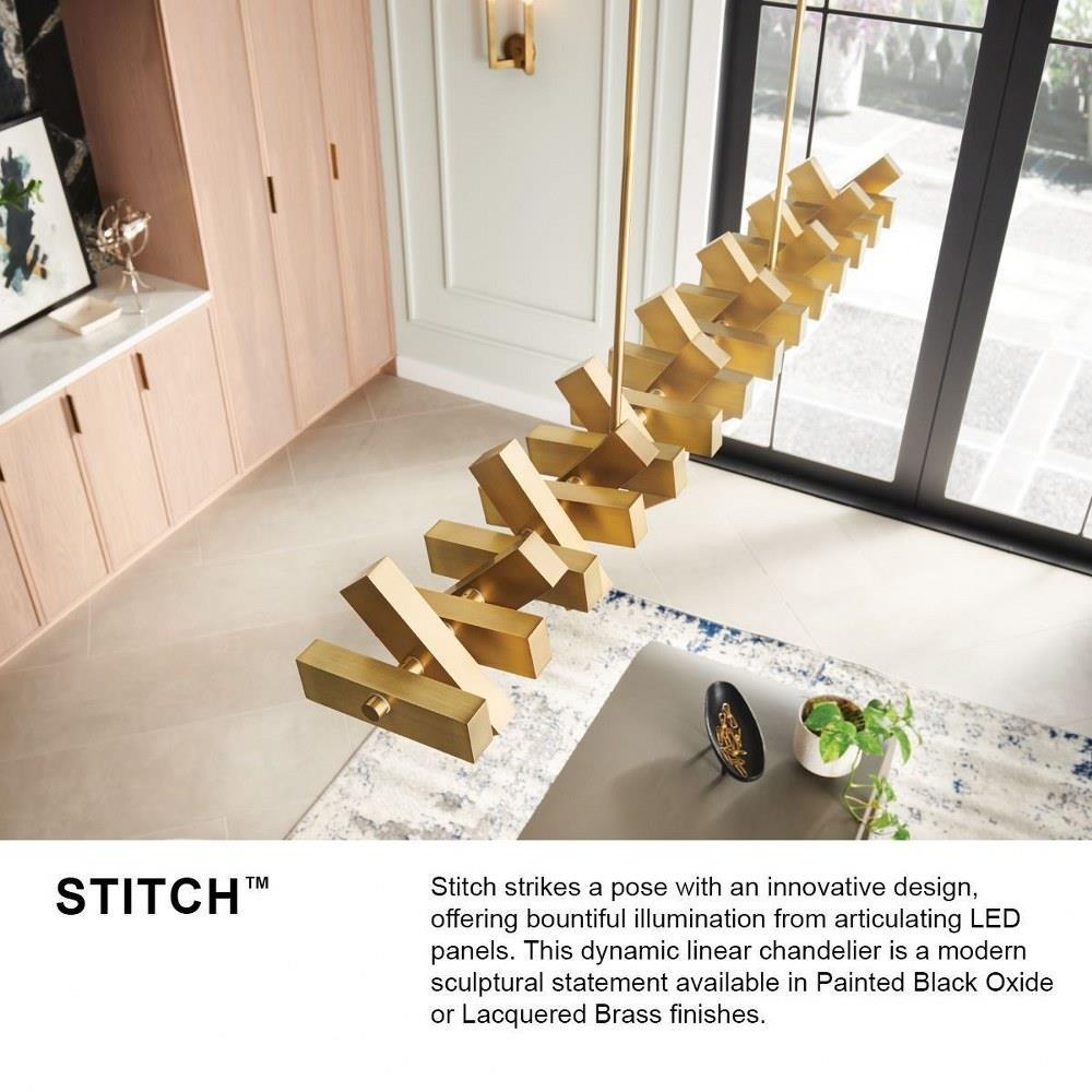 Stitch strikes a pose with an innovative design, offering bountiful illumination from articulating LED panels. This dynamic linear chandelier is a modern sculptural statement available in Black Oxide or Lacquered Brass finishes.