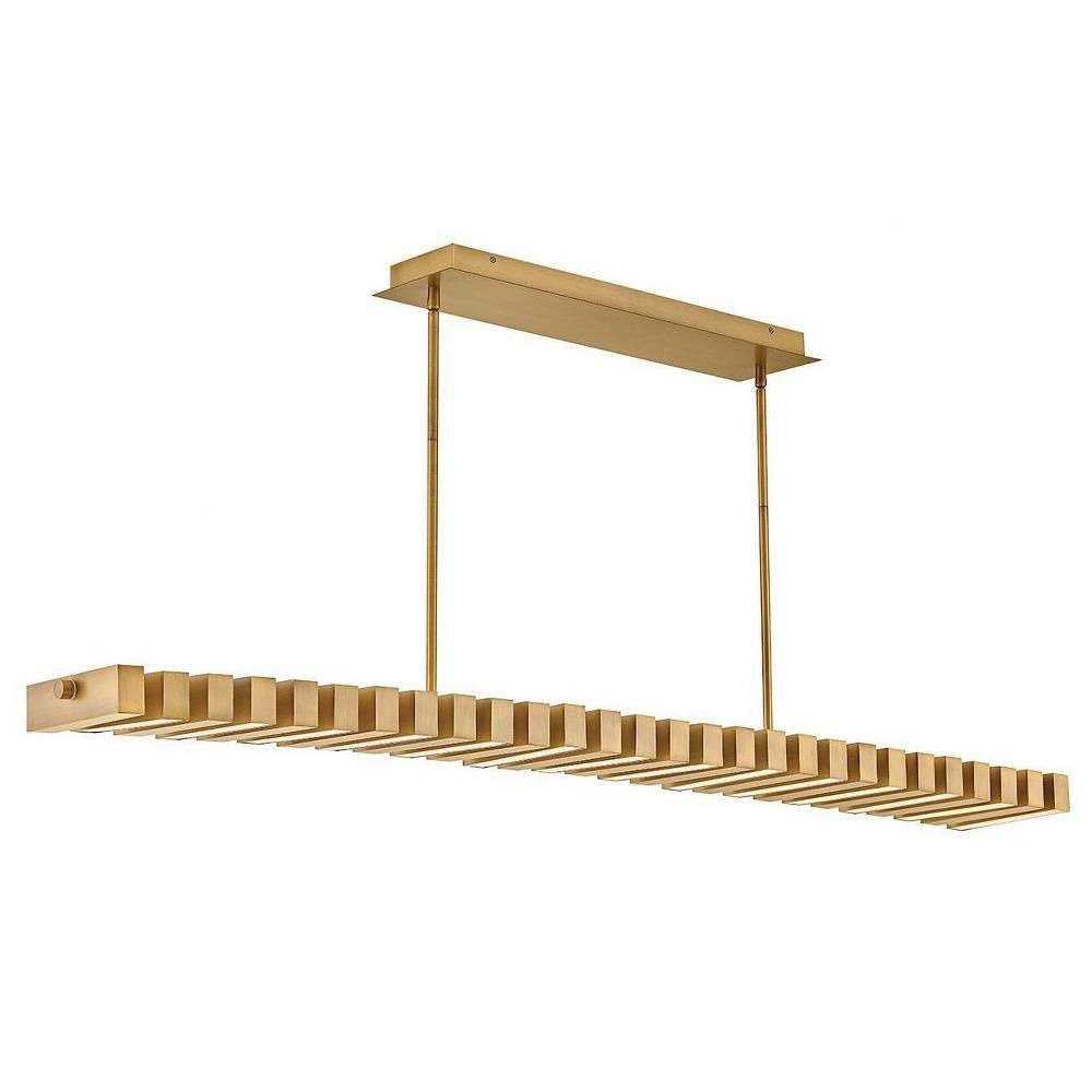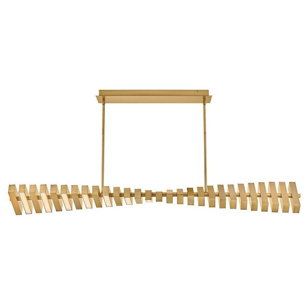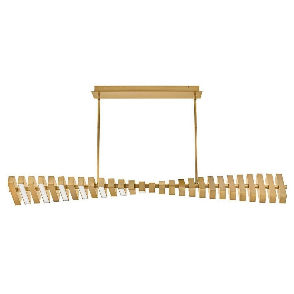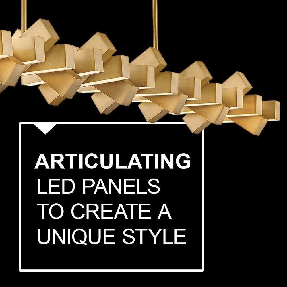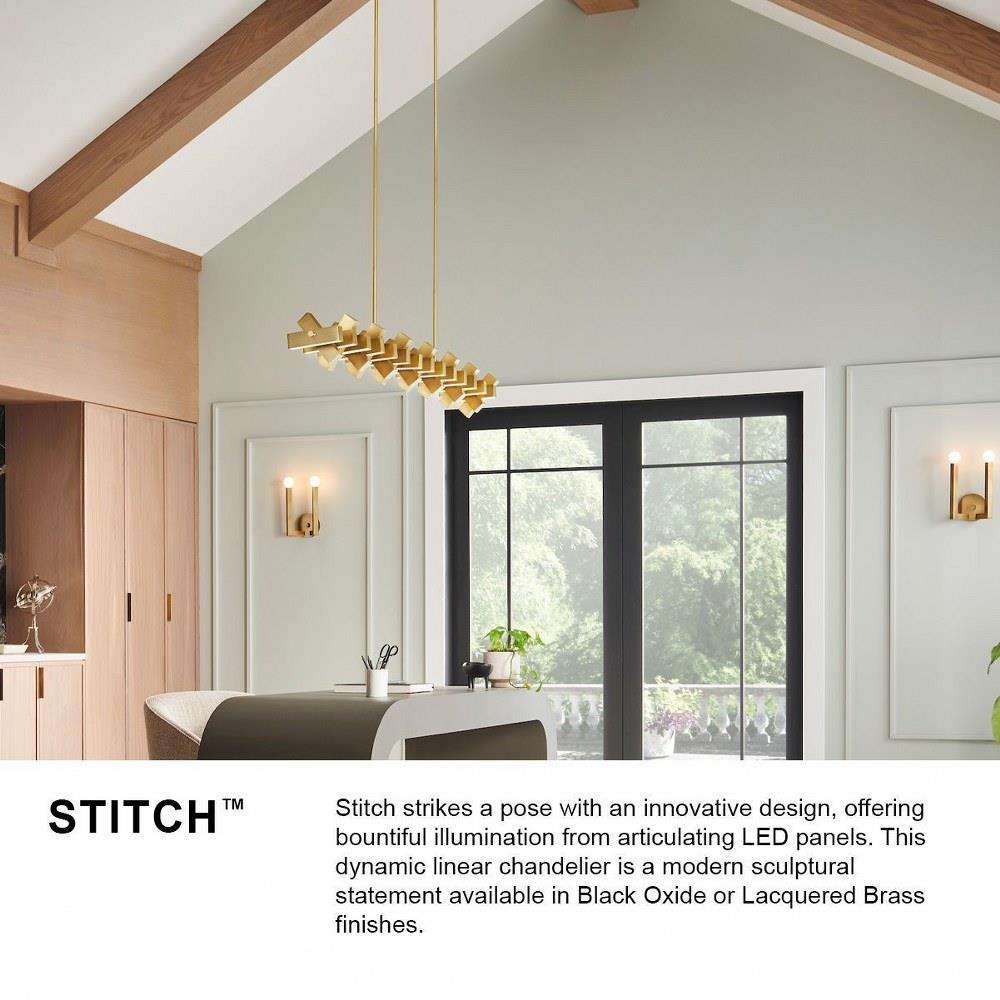 Stitch strikes a pose with an innovative design, offering bountiful illumination from articulating LED panels. This dynamic linear chandelier is a modern sculptural statement available in Black Oxide or Lacquered Brass finishes.