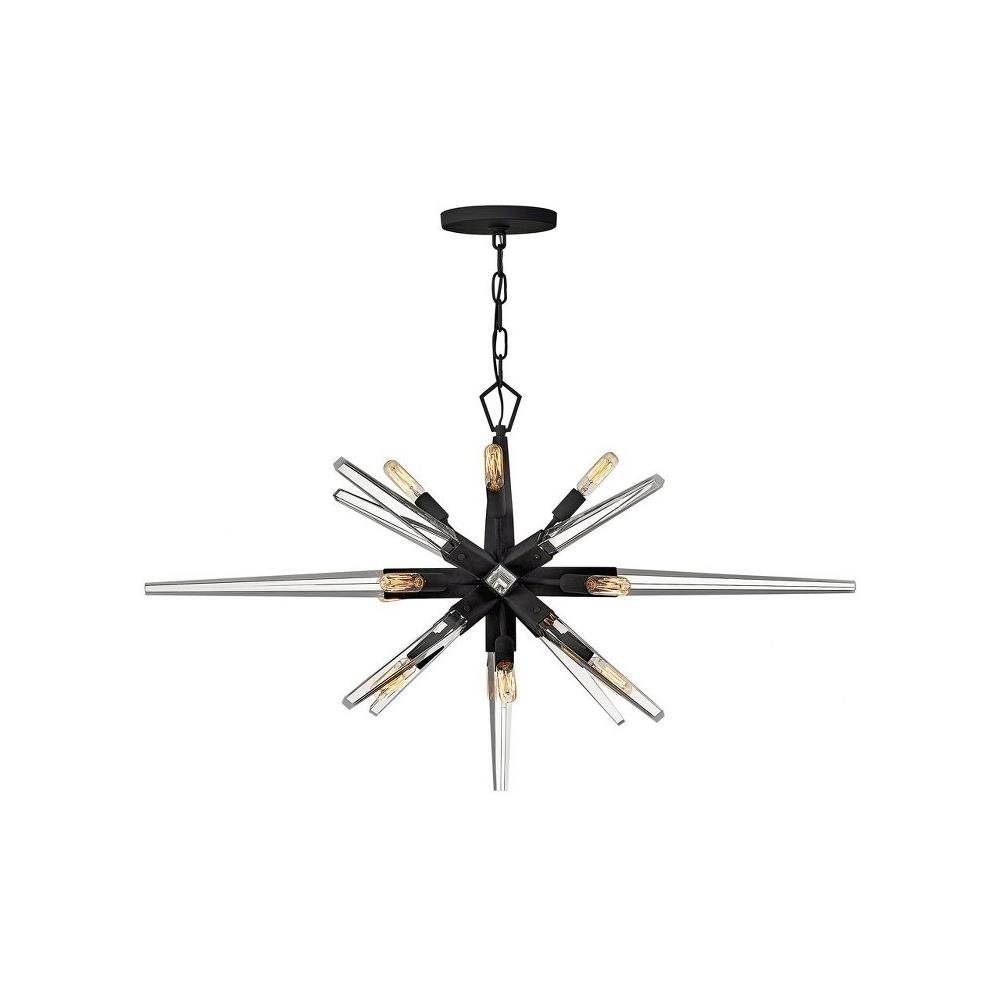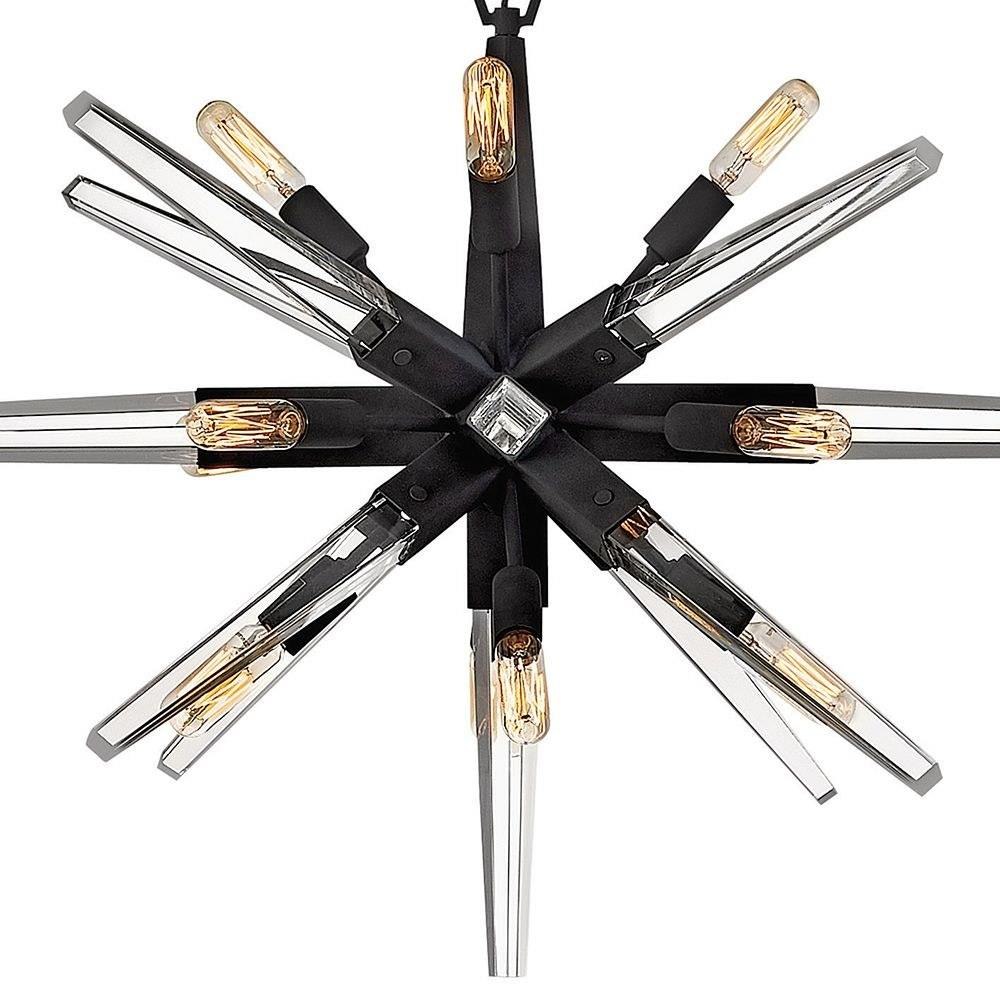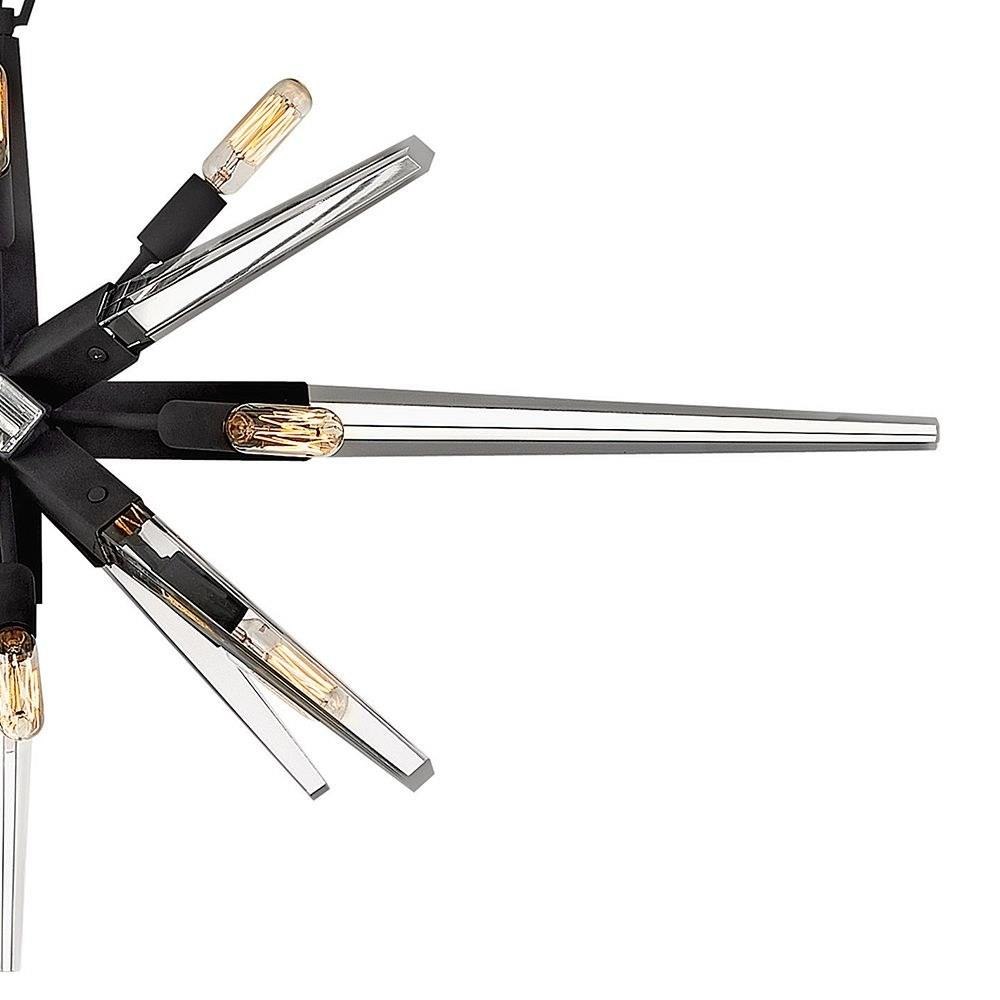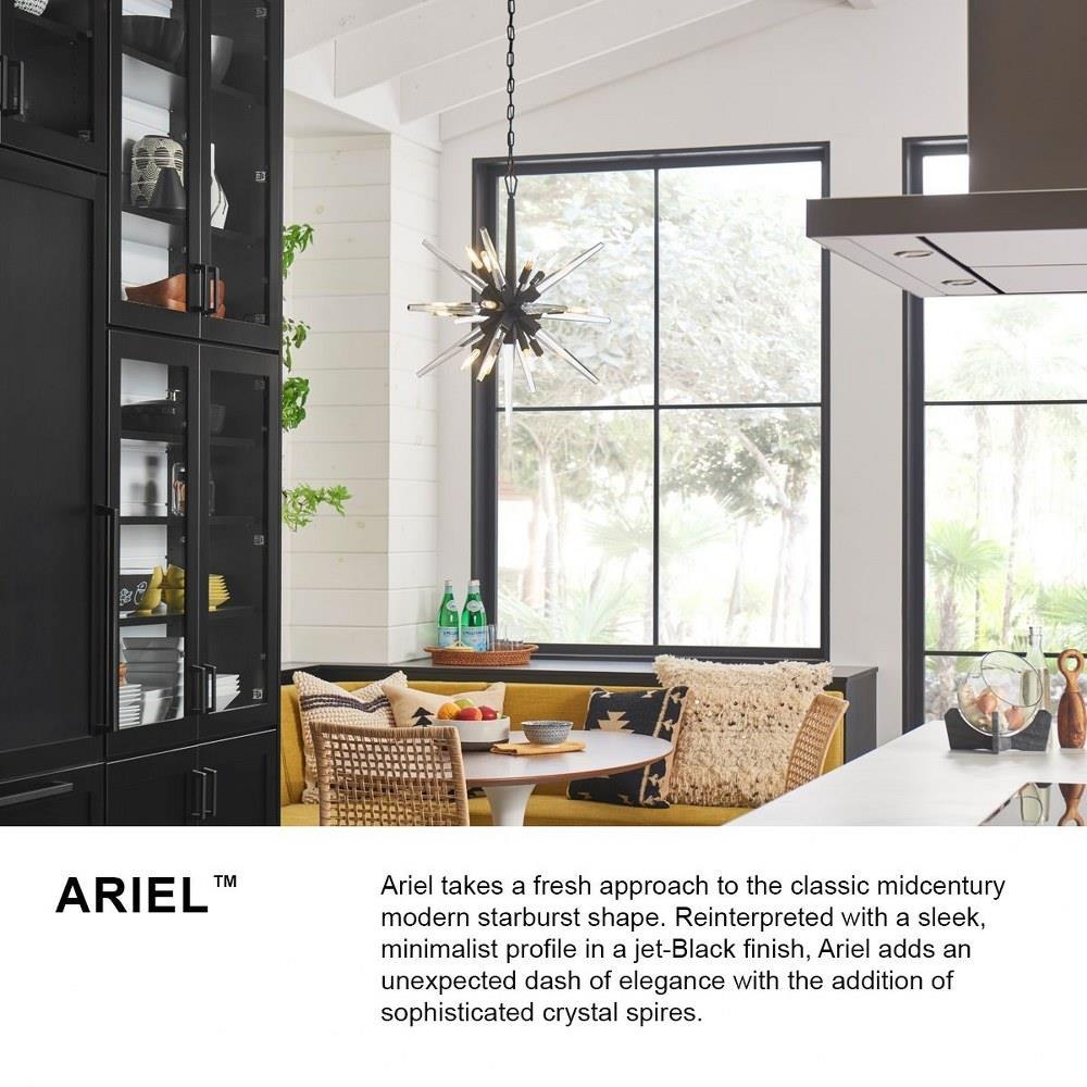 Ariel takes a fresh approach to the classic mid-century modern starburst shape. Reinterpreted with a sleek, minimalist profile in a jet-Black finish, Ariel adds an unexpected dash of elegance with the addition of sophisticated crystal spires. This chain or cable hung fixture may be installed on any sloped ceiling. Suitable for use in dry (indoor) locations as defined by NEC and CEC. Meets United States UL Underwriters Laboratories & CSA Canadian Standards Association Product Safety Standards Striking and glamorous silhouette with luxe details and a rich finish makes a dramatic statement Striking black finish enhances design.