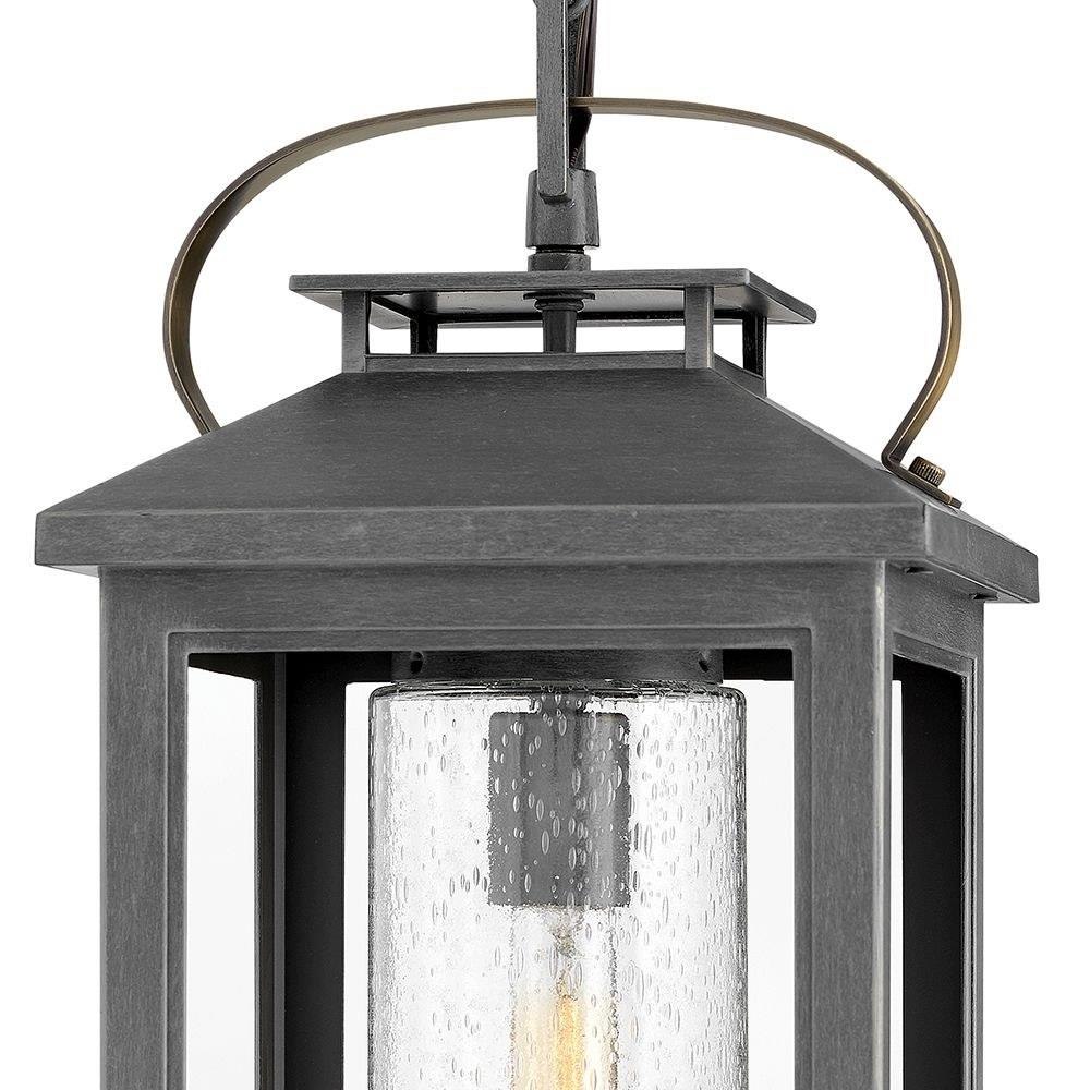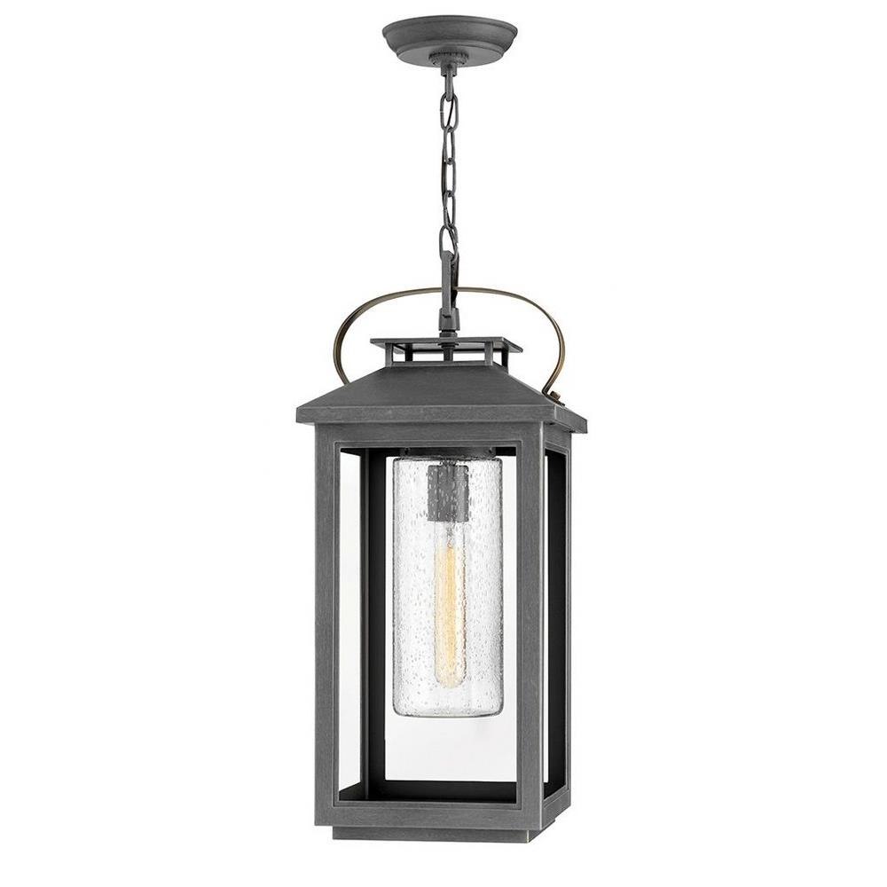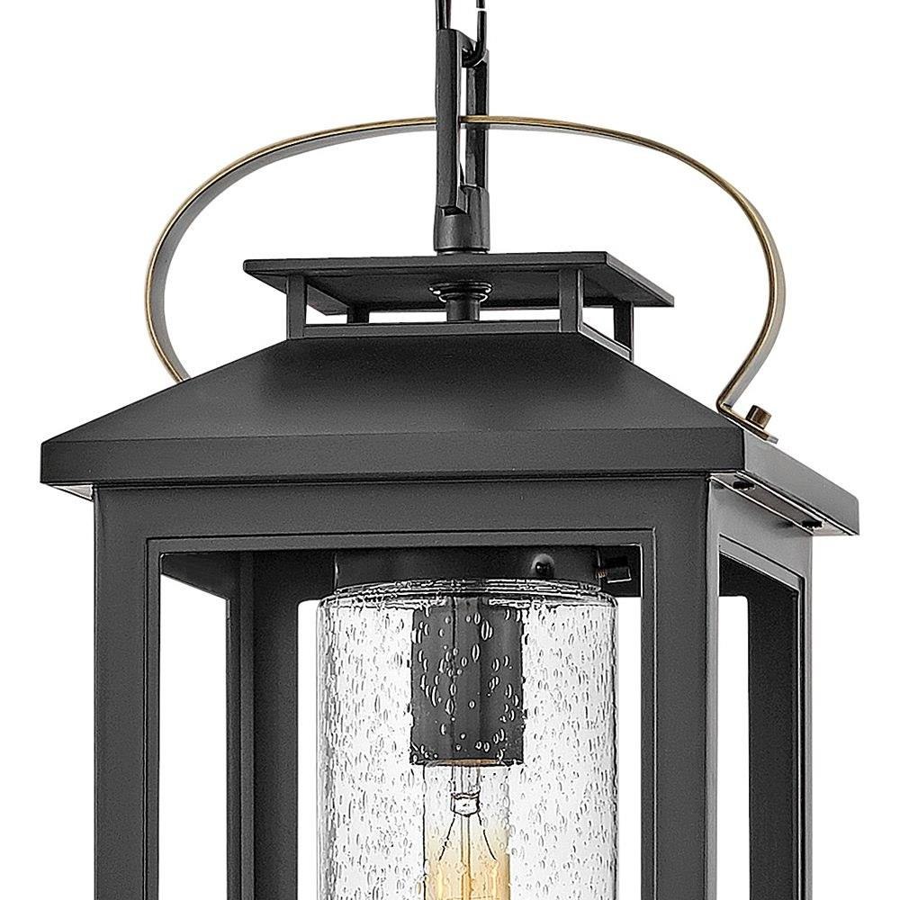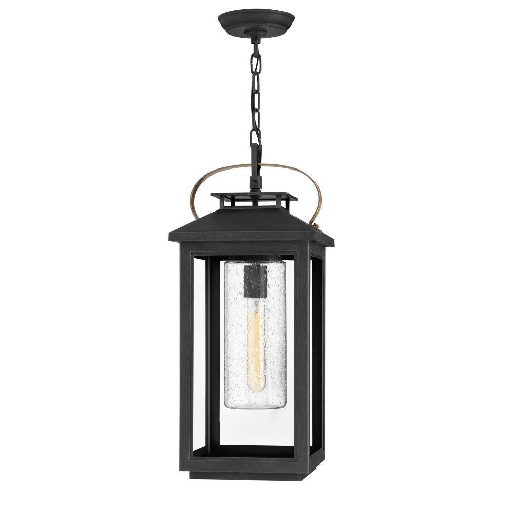 Classic and elegant, Atwater offers beauty and endurance. Constructed from a composite material and treated with an anti-fading agent, the updated coastal design incorporates elegant brass accents, handle, and an inner glass that creates a faux candle effect. The high-performance finish is resistant to rust and corrosion with a 5-year warranty.5 year finish warranty / This chain or cable hung fixture may be installed on any sloped ceiling / Innovative Exterior 12-volt solution for all-in-one lamp, lighting and high design look. Transformer is required and sold separately. / Suitable for use in damp locations as defined by NEC and CEC. Meets United States UL Underwriters Laboratories & CSA Canadian Standards Association Product Safety Standards / LED Bulbs carry a 3-year limited warranty / Striking black finish enhances design / 12-volt LED vintage filament bulbs included / The Coastal Elements Collection offers versatile designs, constructed of composite materials and coated with anti-fading finishes, for maximum durability in harsh climates. / Variety of stylish fixtures customized with vintage filament bulbs / Offers low voltage semi-permanent solutions for unique areas such as pergolas when paired with low voltage Hinkley transformer / Classic, modern style with a nautical flair adds elegance to a variety of exteriors