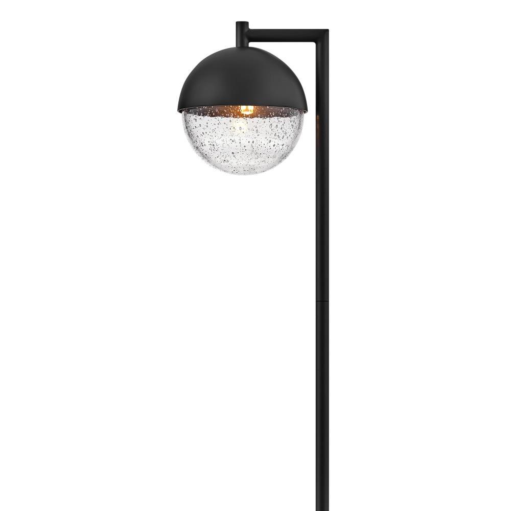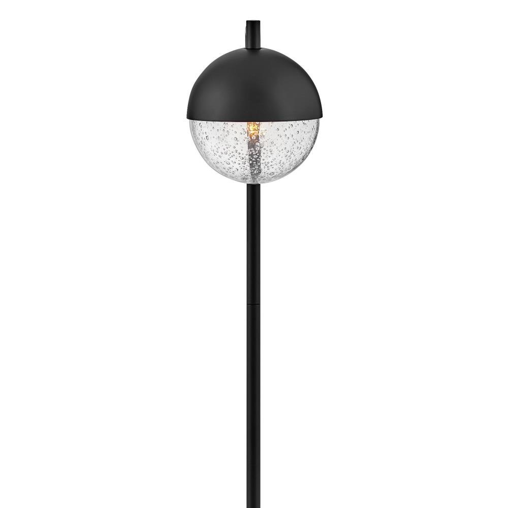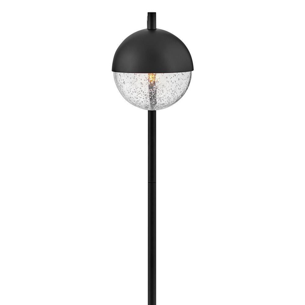The Revolve 1550SK path light delivers precise illumination with a 360-degree beam spread, ideal for enhancing outdoor living spaces and pathways. Measuring 22.5 inches in height, 2.5 inches in width, and 6 inches in length, this fixture features a half aluminum, half clear seedy glass globe that provides both durability and aesthetic appeal. Suspended from a slender post bent at a 90-degree angle, the design complements modern and transitional architectural styles with its satin black finish, contributing to both curb appeal and outdoor safety.