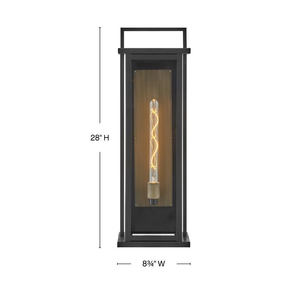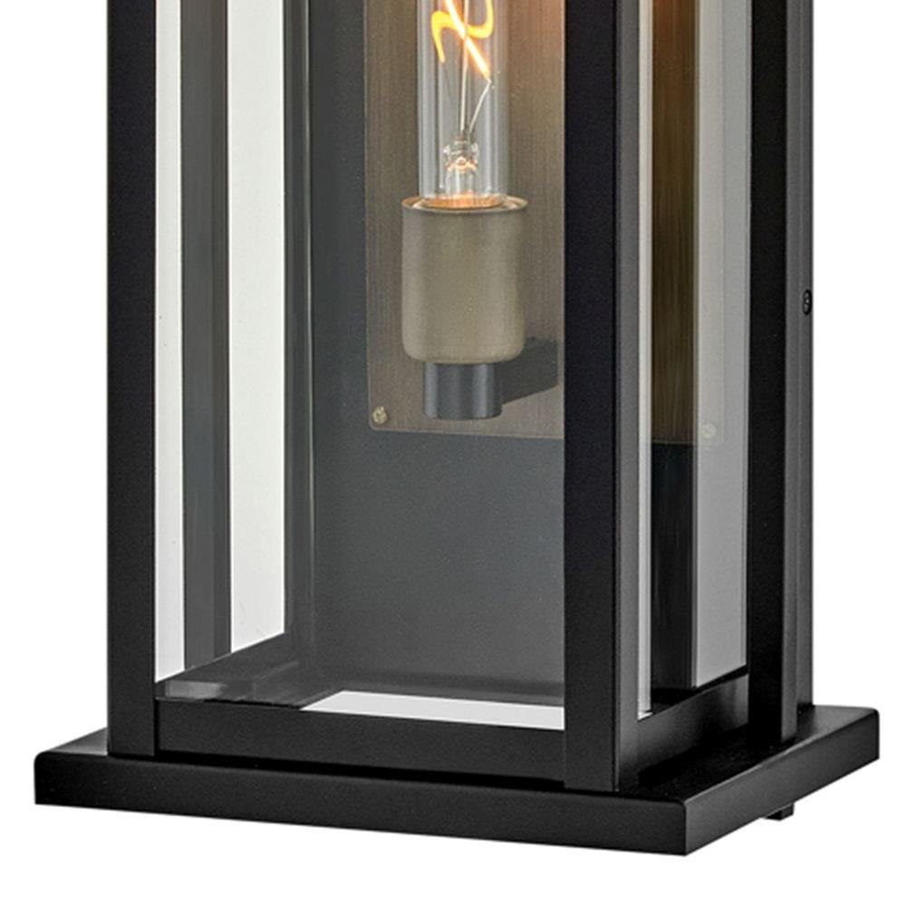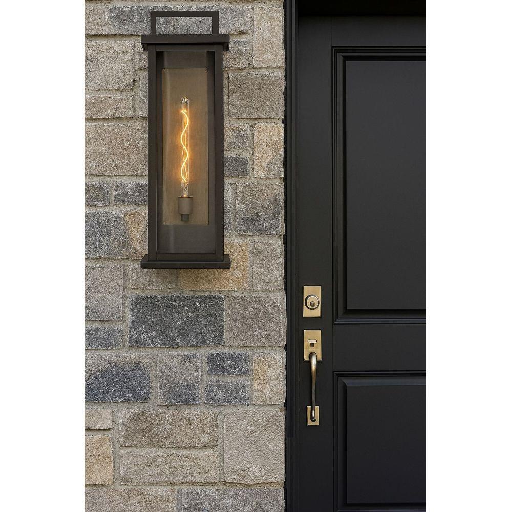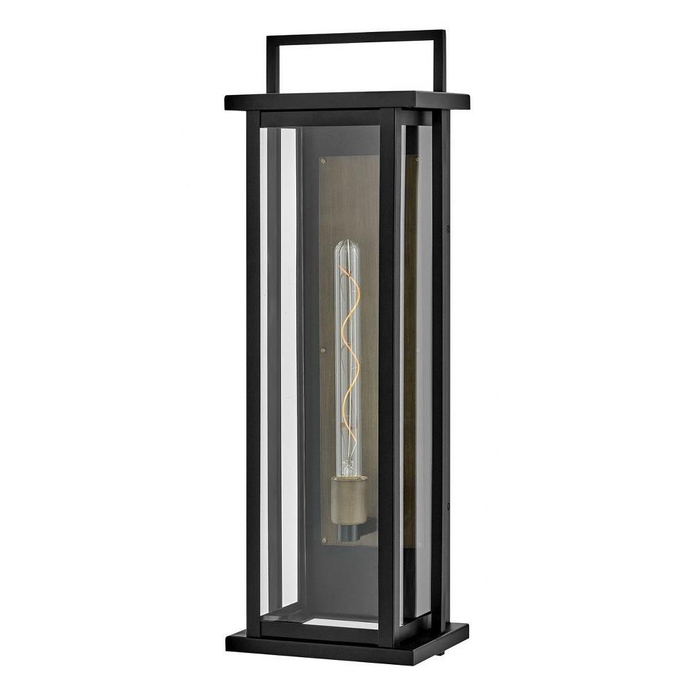 Sleek but stately, Langston demands attention with its bold silhouette in Black with a gleaming Burnished Bronze reflector. Available as an over-scaled option, Langston delivers a stunning light beam spread thanks to its extra-large panes of clear glass.Suitable for use in wet (outdoor direct rain or sprinkler) locations as defined by NEC and CEC. Meets United States UL Underwriters Laboratories & CSA Canadian Standards Association Product Safety Standards / Classic lines and heritage details complement traditional architecture / Shown with T-style bulbs (not included) / Striking black finish enhances design / 2 year finish warranty / Mounting hardware is hidden on the backplate to ensure a clean silhouette / Adjustable mounting hardware. Top to outlet range 11" to 18".