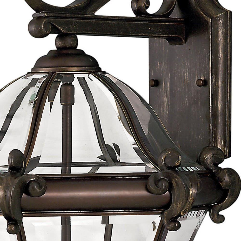 San Clemente’s elegant shape takes center stage with clear bent, beveled and bound glass as the central design element. Cast aluminum and brass construction complemented by exquisite cast ornamental detailing completes its captivating appeal.Our Estate Collections boast a breadth of fixtures defined by coordinating composition, enduring architecture, and time-honored craftsmanship, designed to meet the needs of expansive properties with extended outdoor living spaces. From the entrance of your driveway to the depths of your backyard, these collections provide cohesive design for stately exteriors. / Suitable for use in wet (outdoor direct rain or sprinkler) locations as defined by NEC and CEC. Meets United States UL Underwriters Laboratories & CSA Canadian Standards Association Product Safety Standards / Classic lines and heritage details complement traditional architecture / 2 year finish warranty / Bold and robust dark bronze finish