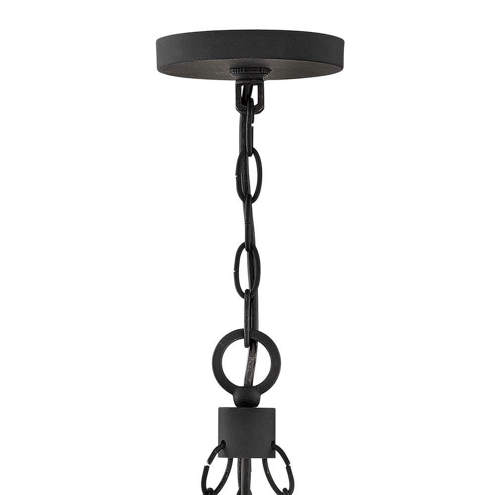 This chain or cable hung fixture may be installed on any sloped ceiling / Suitable for use in wet (outdoor direct rain or sprinkler) locations as defined by NEC and CEC. Meets United States UL Underwriters Laboratories & CSA Canadian Standards Association Product Safety Standards / Rustic elements with bold, refined details complement a variety of facades from farmhouse to contemporary architecture / The stylish Open Air collection includes outdoor-rated chandeliers, pendants and sconces that provide design-conscious solutions to a variety of exterior environments. / Striking black finish enhances design / 2 year finish warranty