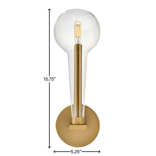 This Medium Single Light Wall Sconce's unique, tapered vintage flask-inspired globe pulls attention and illumination upwards in a one-of-a-kind silhouette. The clear glass globe encases an extended candle sleeve, topped by 5w LED candelabra bulb (not included) - personalize with a different shaped bulb or those with a vintage filament. Available in a bold, rich Black finish or a warm, amber Lacquered Brass.