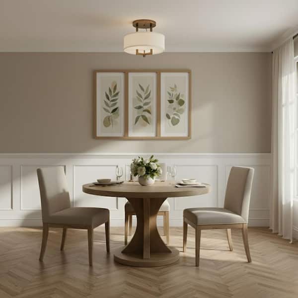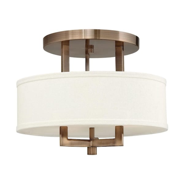 Hampton 15 in. 3-Light Brushed Bronze Semi-Flush Mount with Off-White Linen Hardback Shade