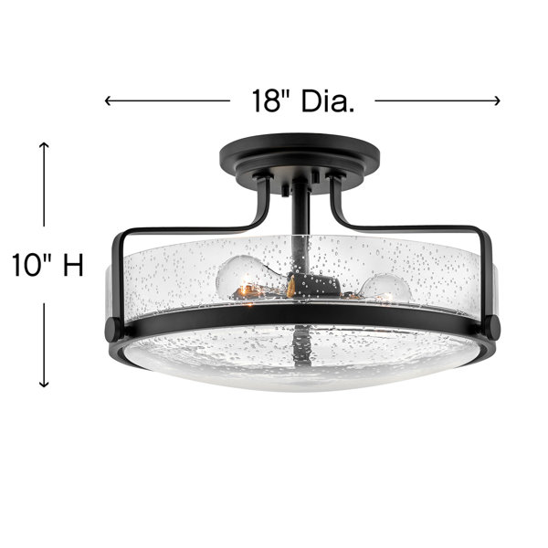 The sophisticated, semi-flush mount ceiling light elevates a traditional fixture with a sleek, Retro style. A unique Clear Seedy Glass bowl rests within a prominent metal ring, suspended from the canopy, with decorative knobs. Illuminated by a trio of 14w Medium LED bulbs (not included), it creates uplighting against the ceiling while casting downlighting throughout the space below. Available in a bold, saturated Black finish - a complementary, timeless tone.
