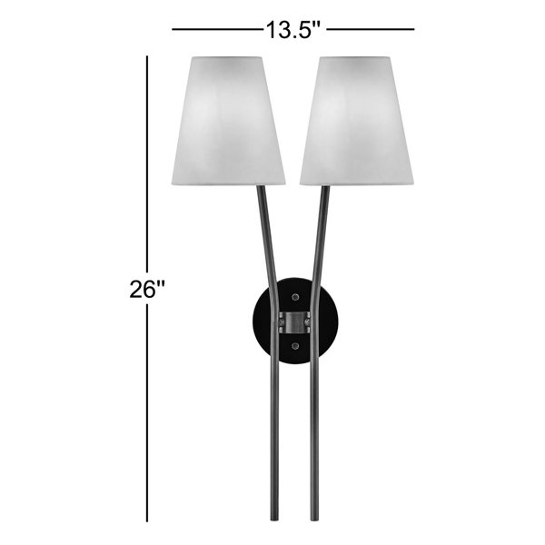 This Two-Light Indoor Wall Sconce from Hinkley has all the Traditional elements of a shaded sconce, but unique design touches that make it extraordinary. The warm, amber Heritage Brass finish to the curved arms is broken up by the bold, Black tone of the backplate. The tapered shades in an off-white fabric attach to the arms by two rivets and are illuminated by (2) 5w Candelabra LED bulbs (not included). This traditional sconce looks great in any dining rooms, foyers, kitchens, bedrooms, or home offices.
