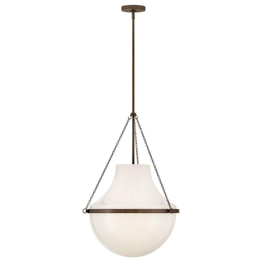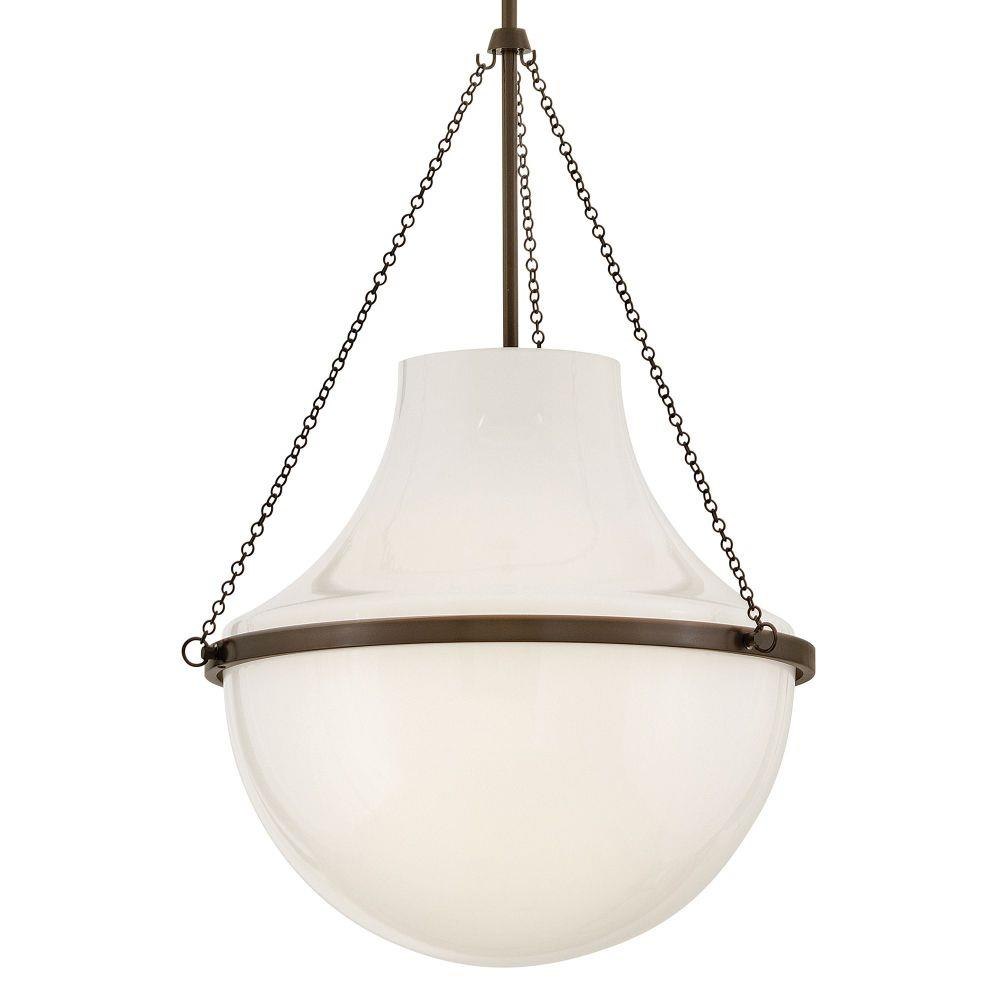Fusing a sculpted, modern form with classically styled details, Collins features a transitional teardrop shade crafted from blown, Cased Opal glass. A central metal band and delicate chain uprights are available in Black Oxide, Heritage Brass, Heritage Bronze, or Polished Nickel finishes.