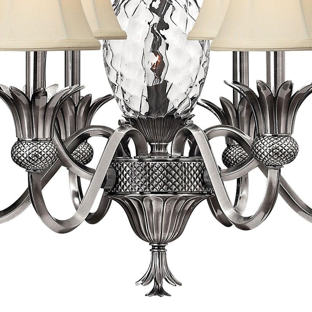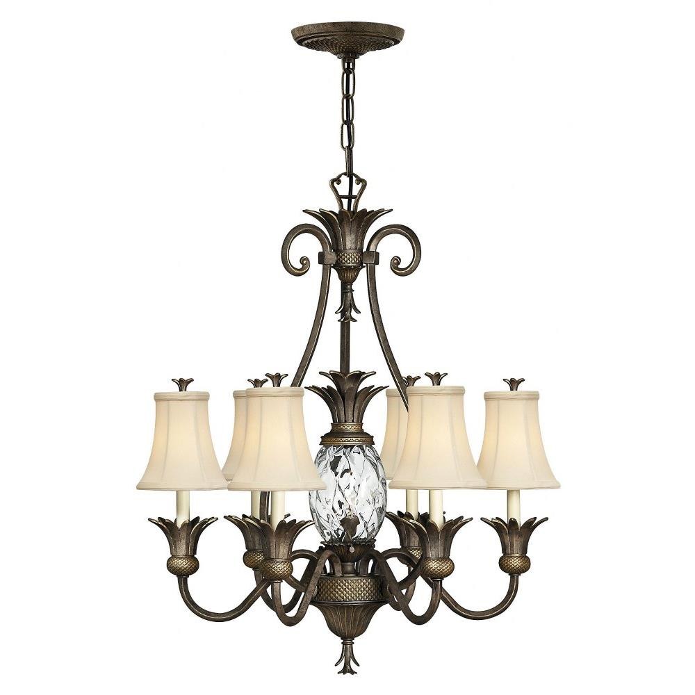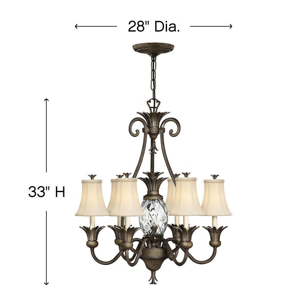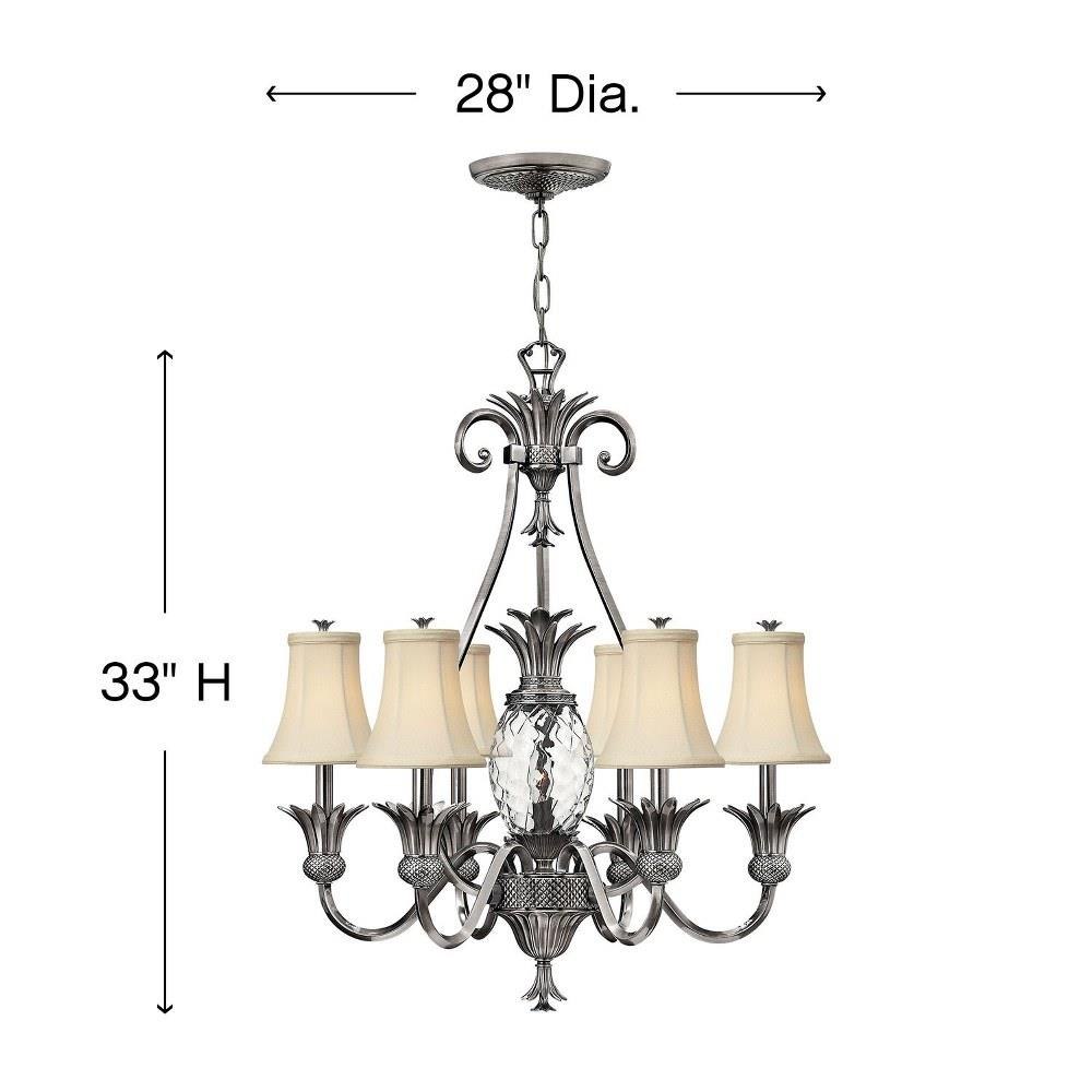 A Hinkley classic, the ornate Plantation collection features exceptional pineapple shaped, clear optic glass that makes a noble statement with matching candle sleeves and elaborate, decorative cast detailing.Suitable for use in dry (indoor) locations as defined by NEC and CEC. Meets United States UL Underwriters Laboratories & CSA Canadian Standards Association Product Safety Standards / This chain or cable hung fixture may be installed on any sloped ceiling / Features On/Off switch / Stunning silver patina / Classic, elegant lines and timeless details enhance a traditional space