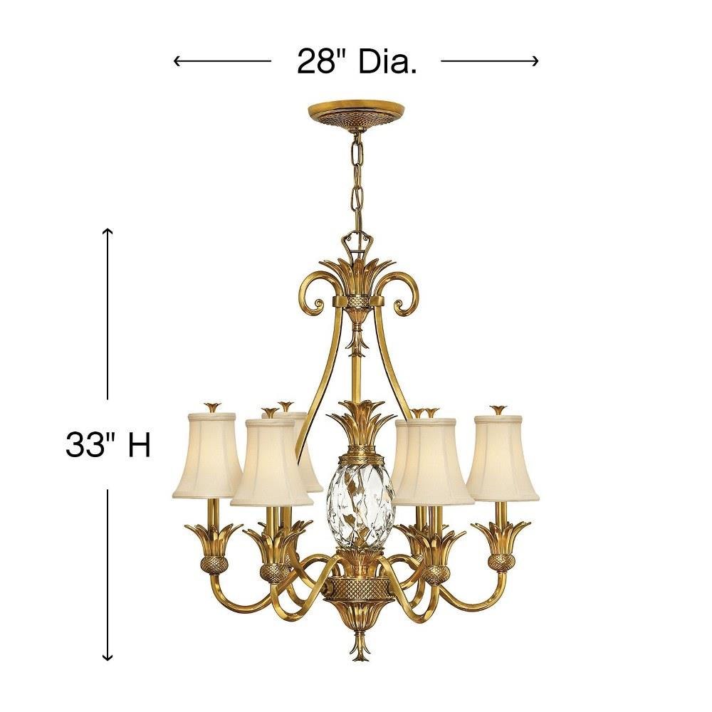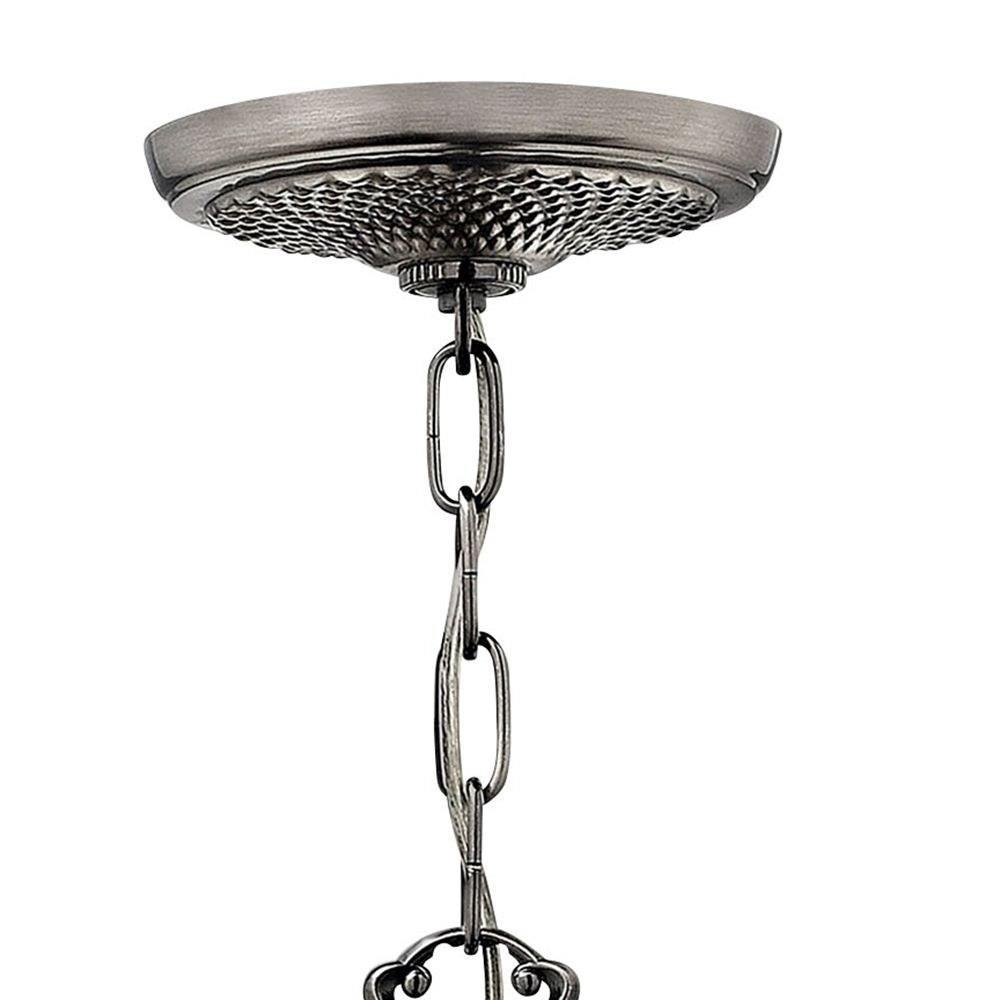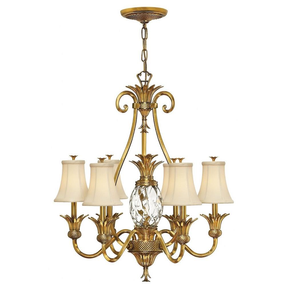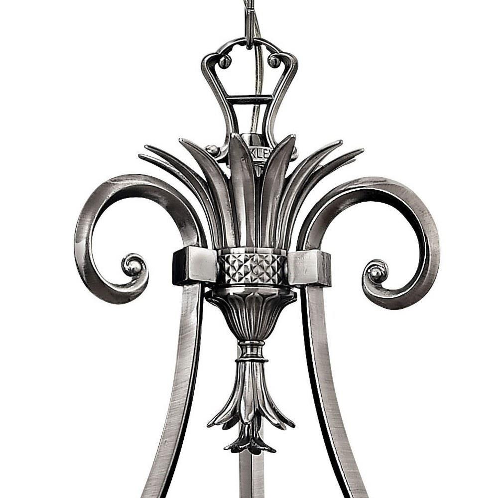 A Hinkley classic, the ornate Plantation collection features exceptional pineapple shaped, clear optic glass that makes a noble statement with matching candle sleeves and elaborate, decorative cast detailing.Suitable for use in dry (indoor) locations as defined by NEC and CEC. Meets United States UL Underwriters Laboratories & CSA Canadian Standards Association Product Safety Standards / This chain or cable hung fixture may be installed on any sloped ceiling / Features On/Off switch / Stunning silver patina / Classic, elegant lines and timeless details enhance a traditional space
