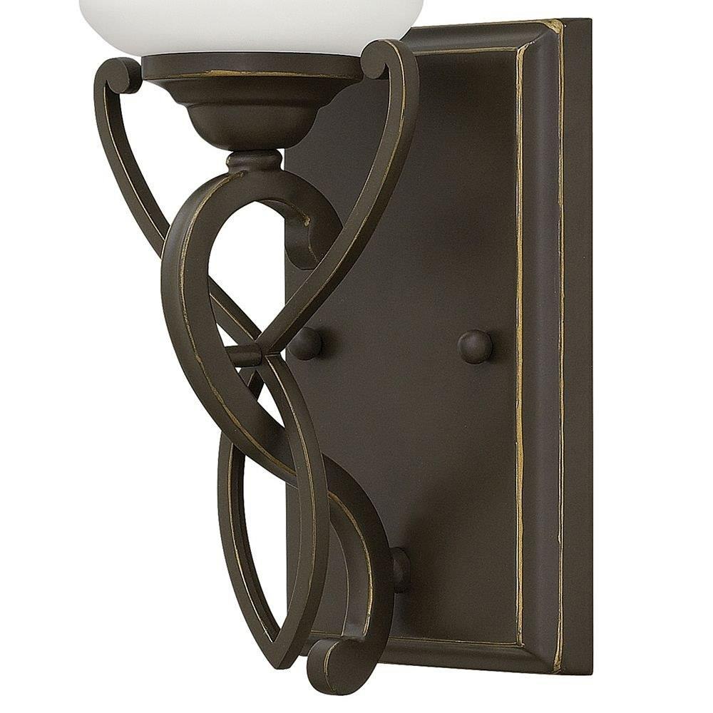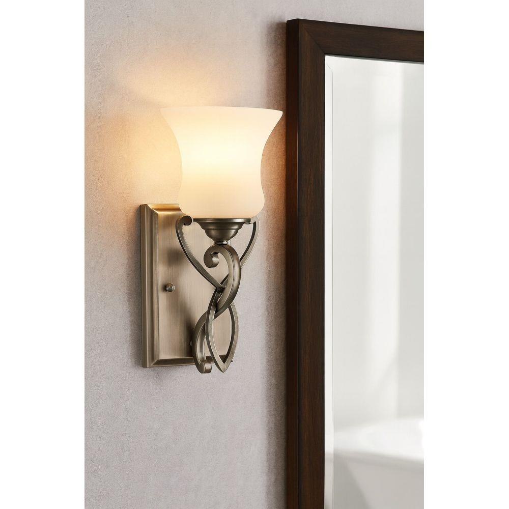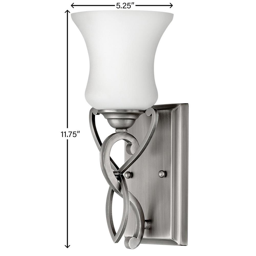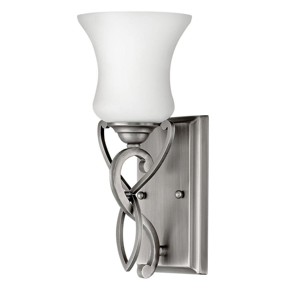 Brooke’s updated traditional look features a minimalist forged scroll design in Antique Nickel and Olde Bronze that elegantly complements its etched opal glass.Fixture can be mounted either up or down / Suitable for use in damp locations as defined by NEC and CEC. Meets United States UL Underwriters Laboratories & CSA Canadian Standards Association Product Safety Standards / Merging the best of traditional and modern elements, with a sophisticated and streamlined look / Rich dark brass finish