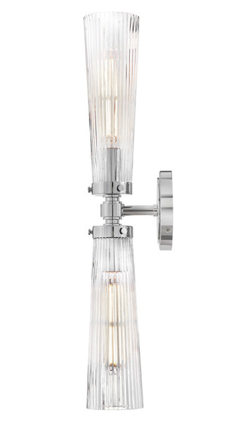 This two light bath vanity's traditional yet glamorous style elevates the illumination and style in bathrooms, en suites, and powder rooms. A pair of clear fluted glass shades are secured around bold sockets by decorative knobs matching the backplate. Mount vertically or horizontally, this elegant fixture has hidden mounting hardware on the backplate to ensure a clean silhouette anywhere - bedside in lieu of a table lamp, or in hallways, staircases, kitchens, or dining rooms.