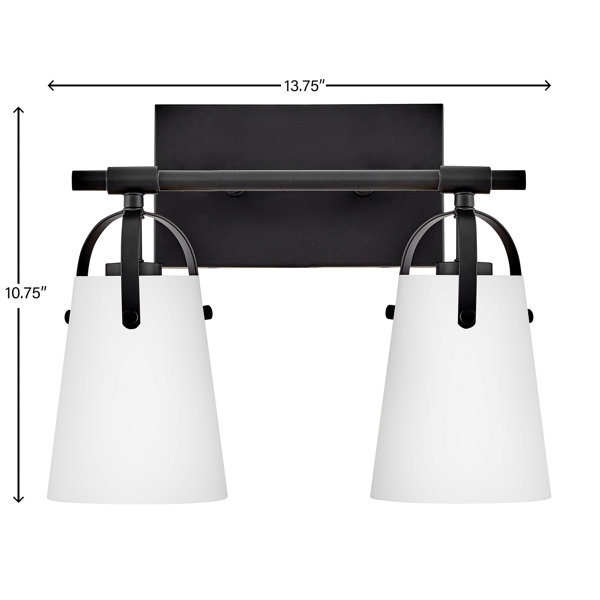 This small two light bath vanity displays a crisp transitional design, with its smooth clean lines, simple rectangular backing, and tapered glass shades that are elegantly held by the sturdy steel arms and their arching handles. This bath vanity modestly illuminates any space of the home and adds the perfect transitional flare to any space. Available in a classic Black or reflective Chrome finish.