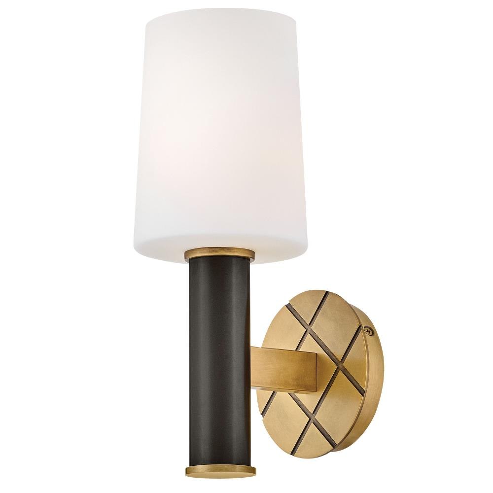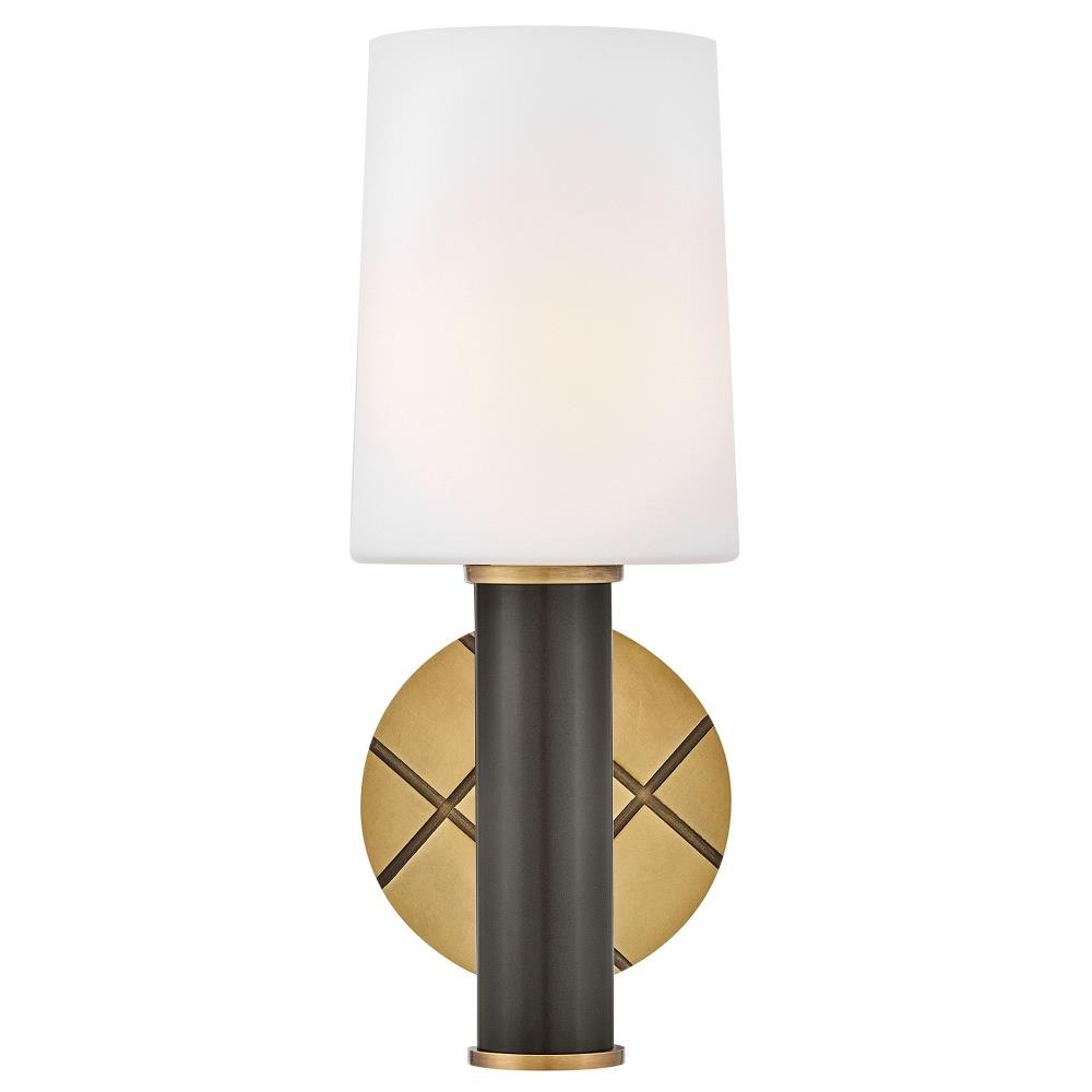 Featuring a geometric, crosshatch motif, Declan’s substantial silhouette is enhanced by a heavy cast backplate and stem accentuated by a contrasting, two-tone finish. A tall, tapered, etched opal glass shade creates softly diffused illumination and a comfortable atmosphere.