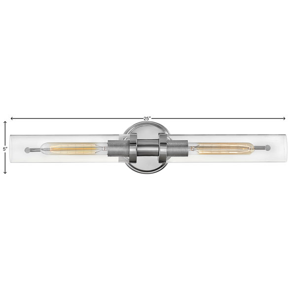 This Industrial-style Two-Light Bath Vanity fixture features a streamlined design combining modern and vintage elements for a refined look. A pair of clear glass cylindrical shades fit around opposing diamond-knurled sockets, extending from the backplate. Illuminated by T-style bulbs (not included), this unique light fixture can be mounted vertically or horizontally. Damp-rated for bathrooms and ensuites, this light is a stylish light anywhere in your home.