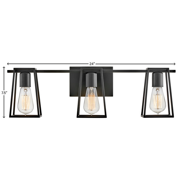 The Hinkley Filmore Three Light Bath Vanity fixture is a bold but minimalist choice for a bathroom, powder room, or any other space in your home. A trio of open cages with sockets, extend from the backplate to create a unique silhouette for 14w Med. LED bulbs (not included). Mount either up or down, flush against the wall, without losing any illumination. In a smooth, almost carbon-like Black finish, the angular lines and sturdy detail collide in a vintage, no-nonsense bath light.