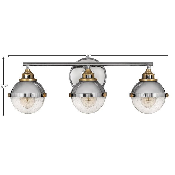 This Three Light Bath Vanity fixture's decorative details are noticed, infusing character in bathrooms, ensuites, and powder rooms. Heritage Brass cast knobs secure Clear Seedy Glass shades in place, while the reflective, chrome-like shine of the Polished Nickel finish complements multiple decors - Chic, Classic, Industrial, Transitional, and Vintage. This trio of lights can be mounted up or down, and each globe is illuminated by an 8w Medium LED bulb (not included).