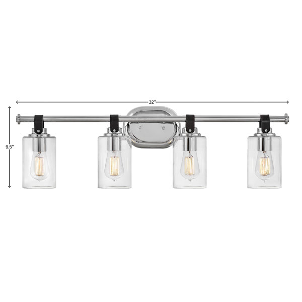 This Four Light Bath Vanity Fixture evokes Modern Americana at its finest. Designed with an equestrian flare in mind, a faux leather finished strap reinforces a rustic simplicity that harmonizes with the modern refinement of clear glass shades. Offered in a Chrome or Heritage Brass finish, this vanity versatility makes it the perfect “anywhere” design including bathrooms, en suites, and powder rooms.