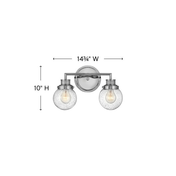 A classic two-light vanity fixture is a blend of mid-century style with a spectacular spin in a rich Heritage Brass finish that can go anywhere. A pair of seamless domes made of Clear Seedy Glass below ribbed cast fitters create a sophisticated silhouette. Inside each globe, an 8w Medium LED bulb (not included) brightens spaces around mirrors and bedsides.