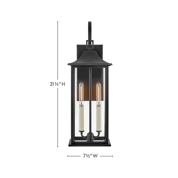 This 2-light outdoor wall fixture stands tall to welcome you home or any guests to your front porch. A water-resistant aluminum frame strikes a rectangular silhouette and a lantern design, complete with a curving arm and a sturdy backplate. Plus, a bold black finish gives it a more classic coastal cottage look. Four transparent glass panels reflect the glow from two bulbs, which are sold separately and compatible with dimmer switches to give you helpful illumination in the evening and throughout the night. It's also wet-rated, so it's safe to be exposed to the elements.